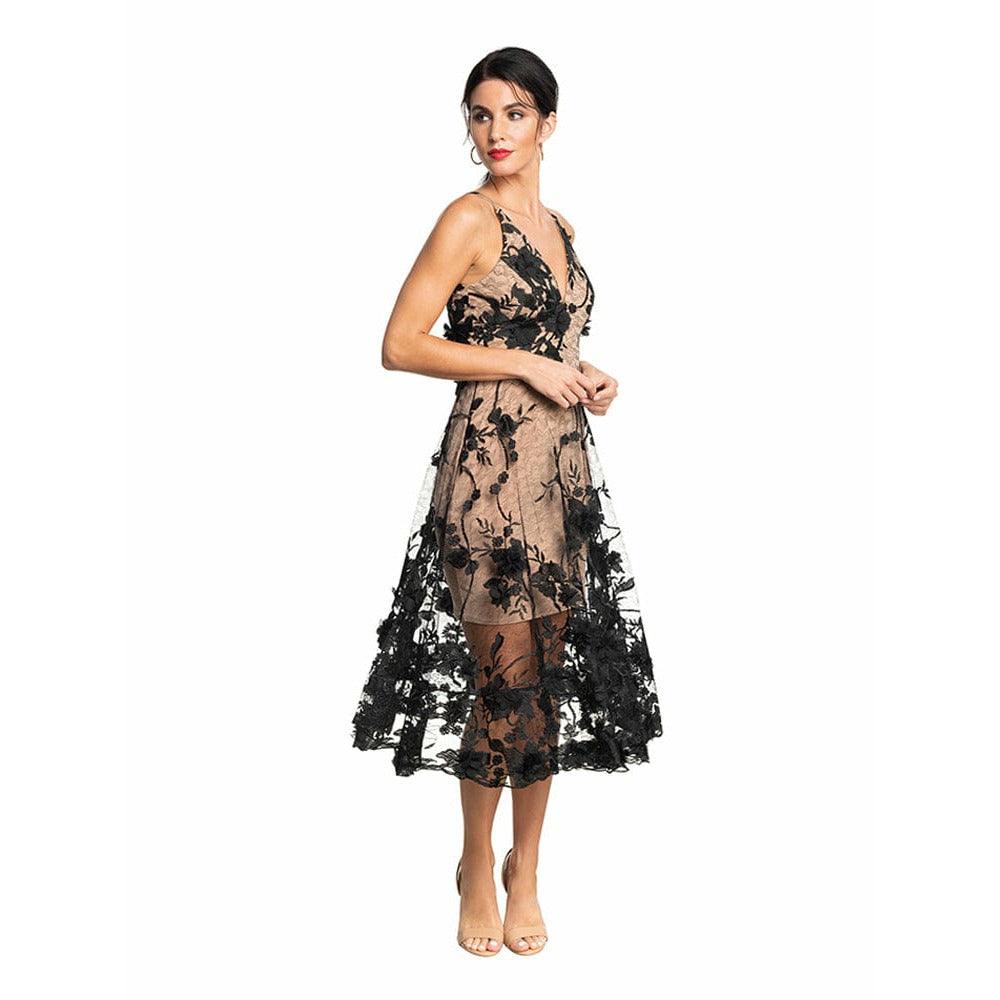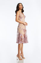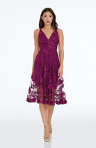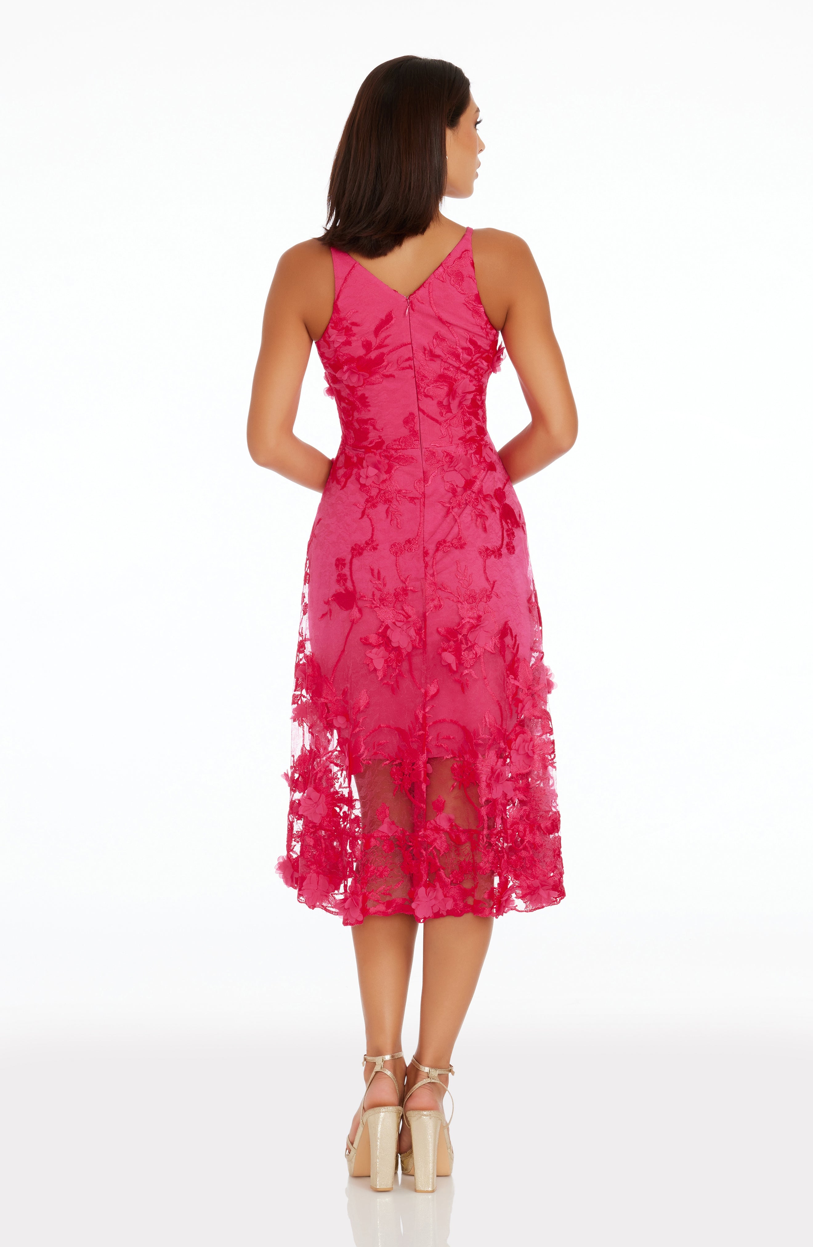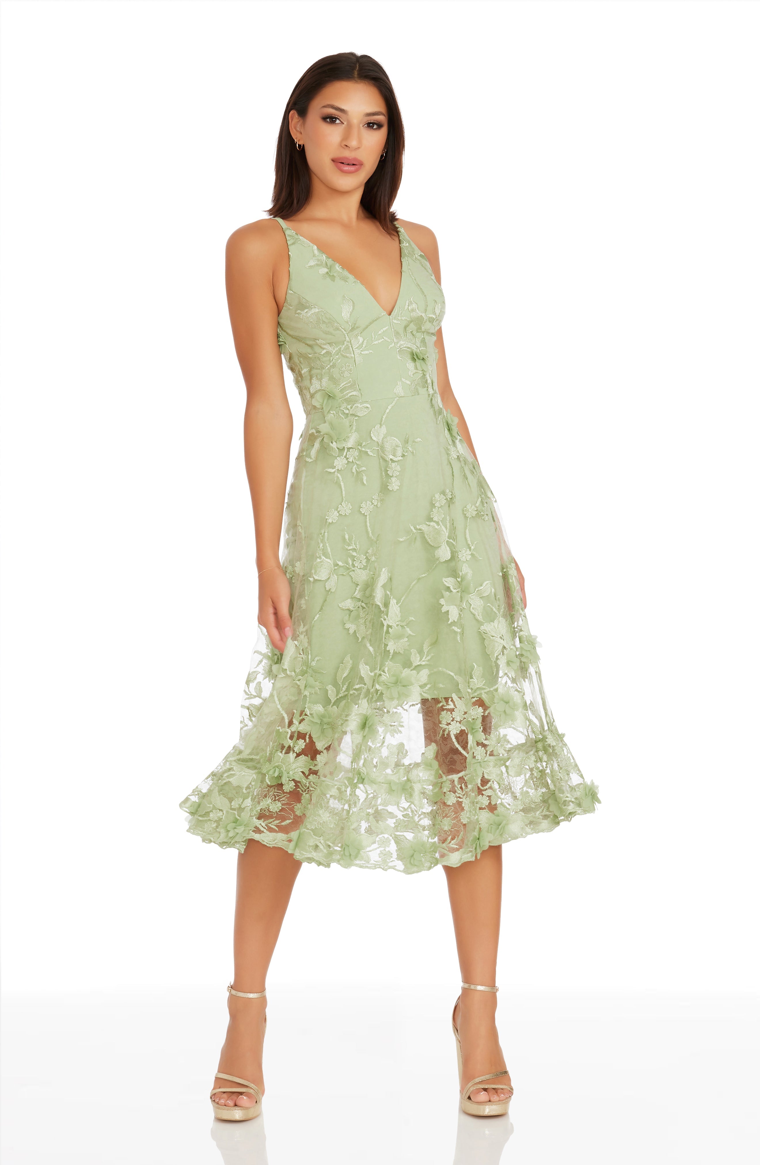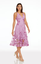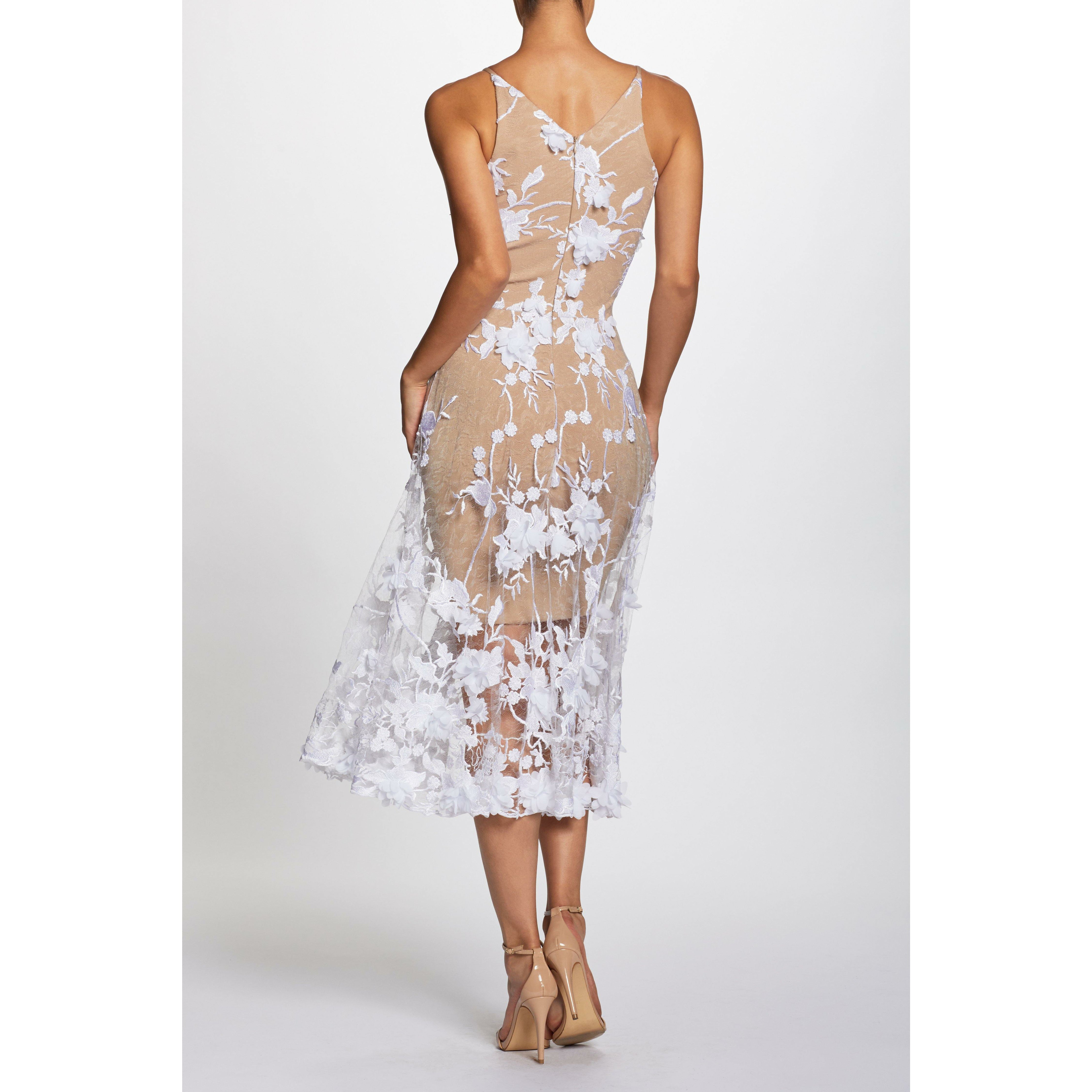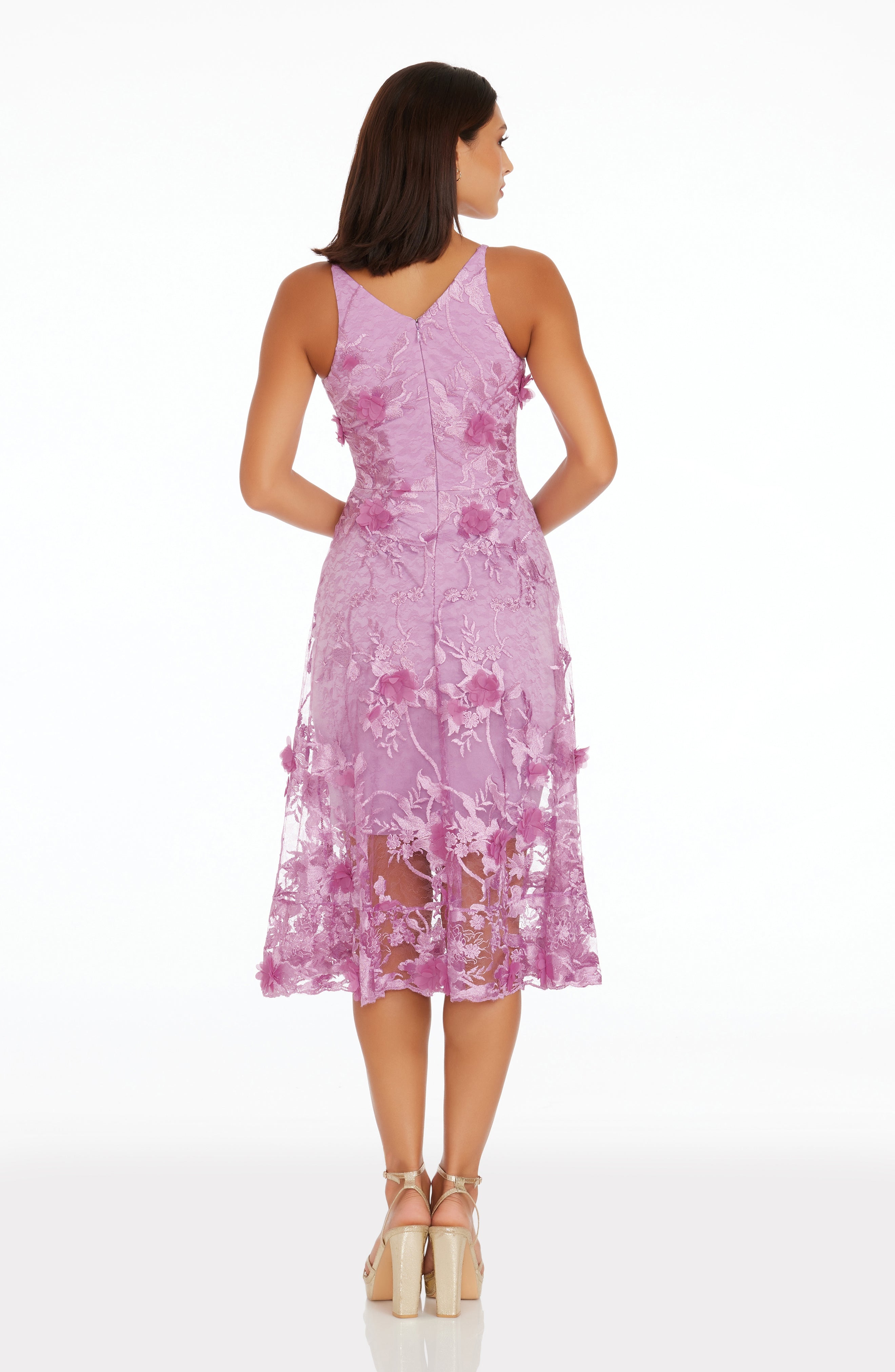 A lush garden is created with beautiful floral embellishments on this one-of-a-kind dress. This spectacular dress has a sleeveless bodice and mini skirt underneath a mesh-lace overlay. The sheer overlay is heavily adorned with floral embroidery and applique and has a flowy midi-length A-line skirt. Thin straps and a matching v-neck and back make the Audrey dress a perfect option for dressy springtime events.