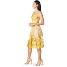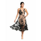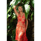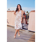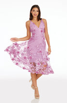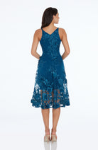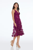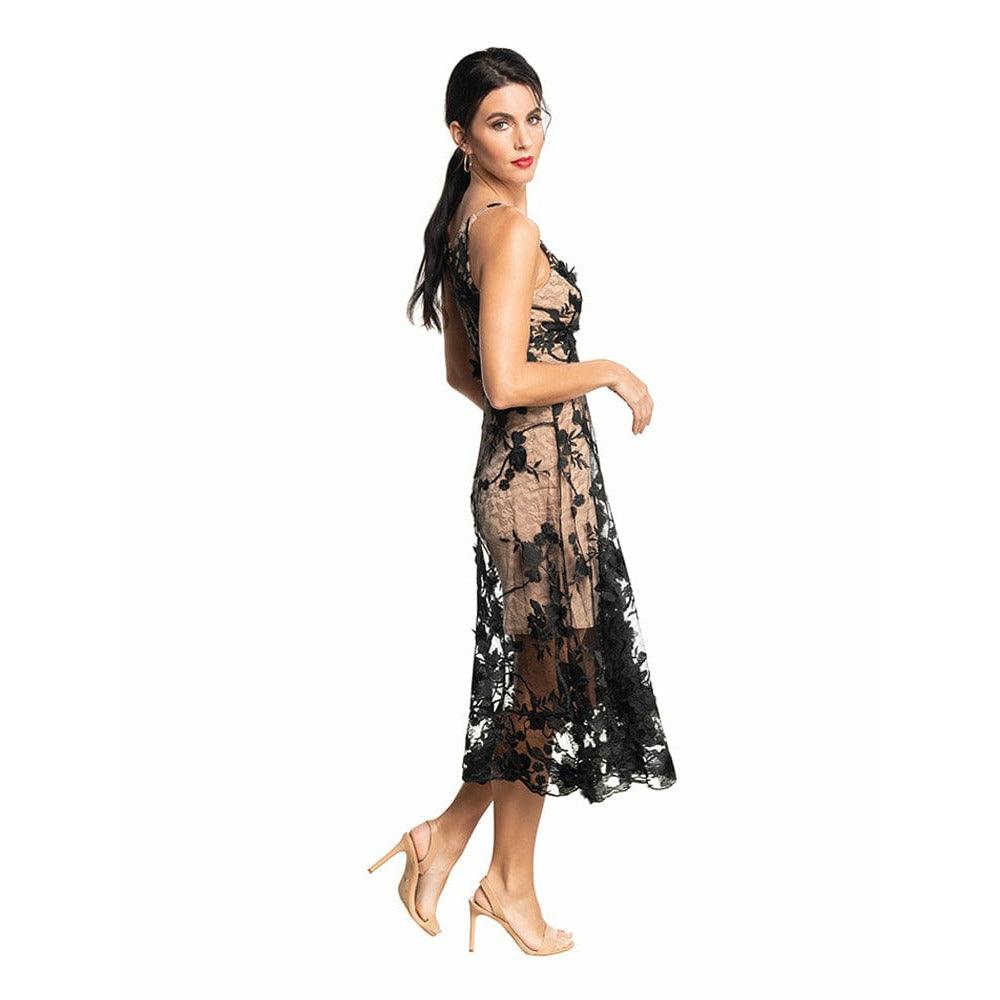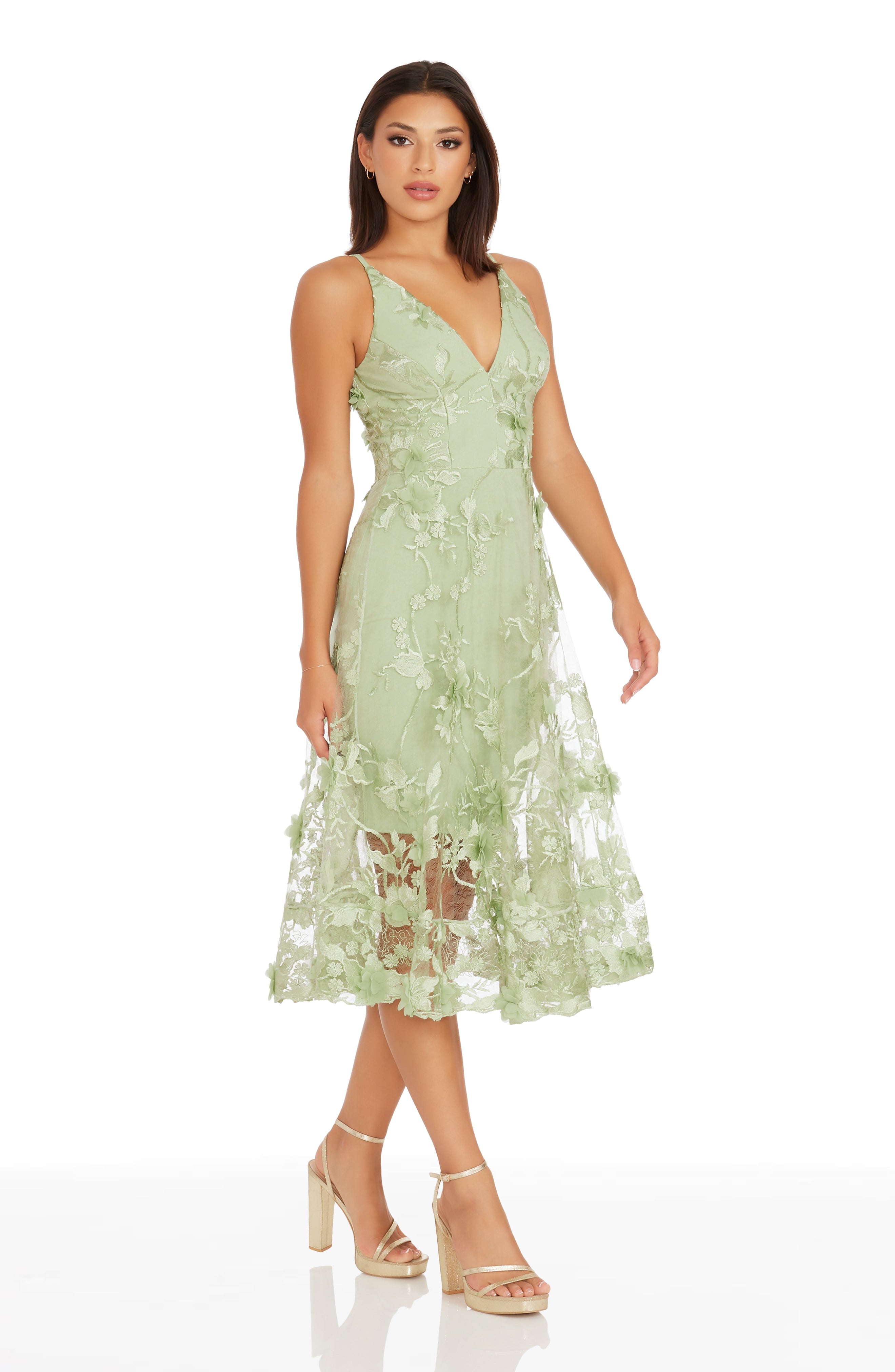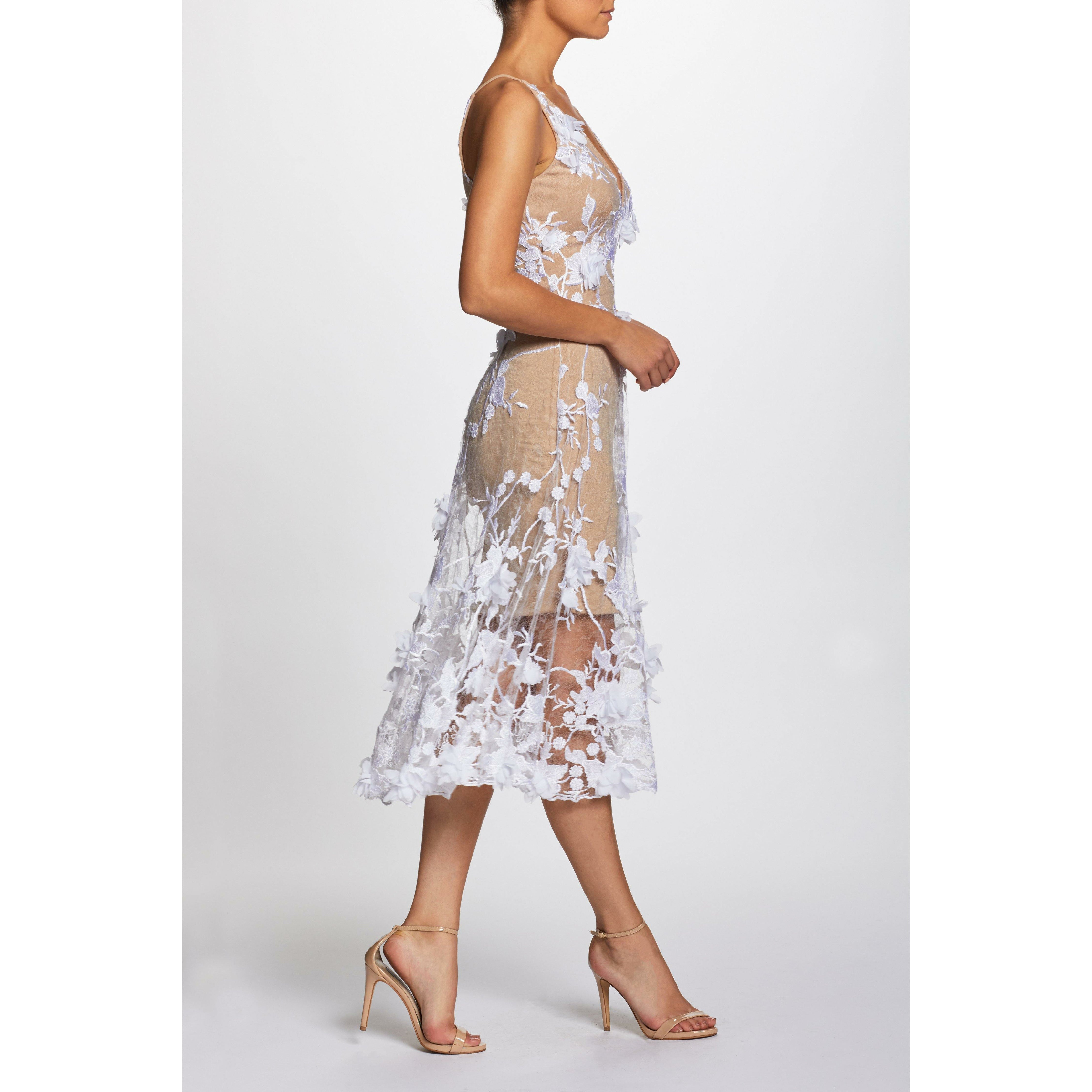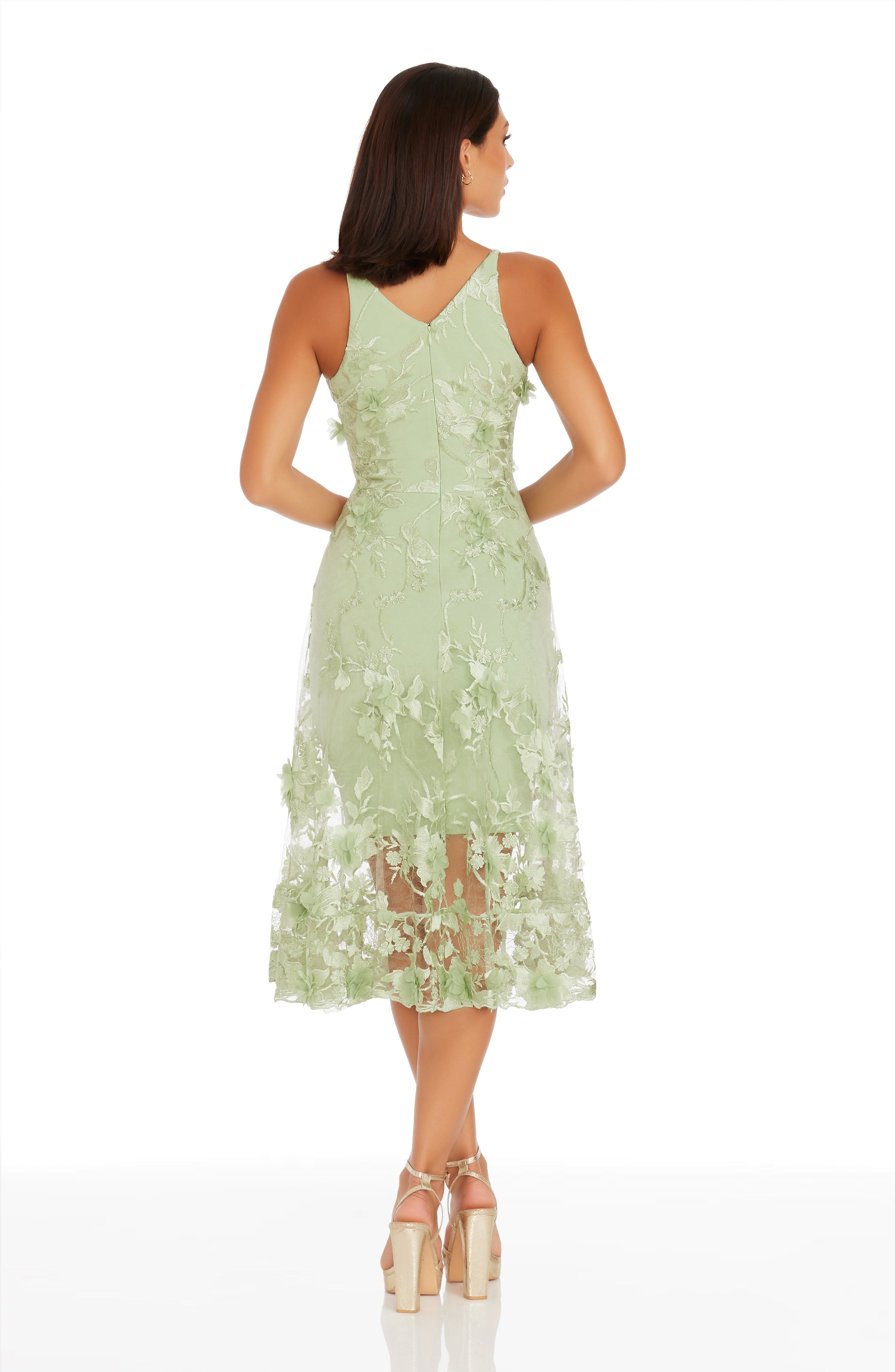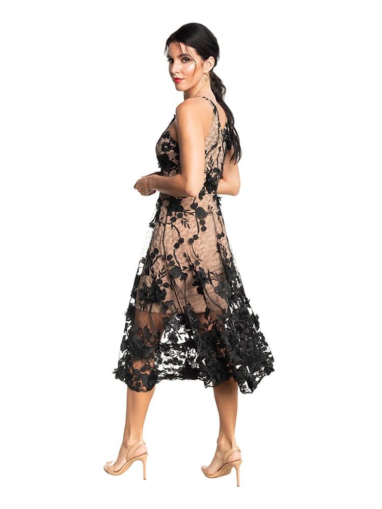 A lush garden is created with beautiful floral embellishments on this one-of-a-kind dress. This spectacular dress has a sleeveless bodice and mini skirt underneath a mesh-lace overlay. The sheer overlay is heavily adorned with floral embroidery and applique and has a flowy midi-length A-line skirt. Thin straps and a matching v-neck and back make the Audrey dress a perfect option for dressy springtime events.