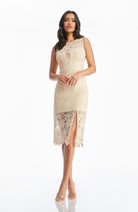 The Avianna cocktail dress is adorned with embroidered floral applique details. This high-neck look also features a sheer center, keyhole back, sheath silhouette, and front left leg slit on a hem that falls just below the knee.