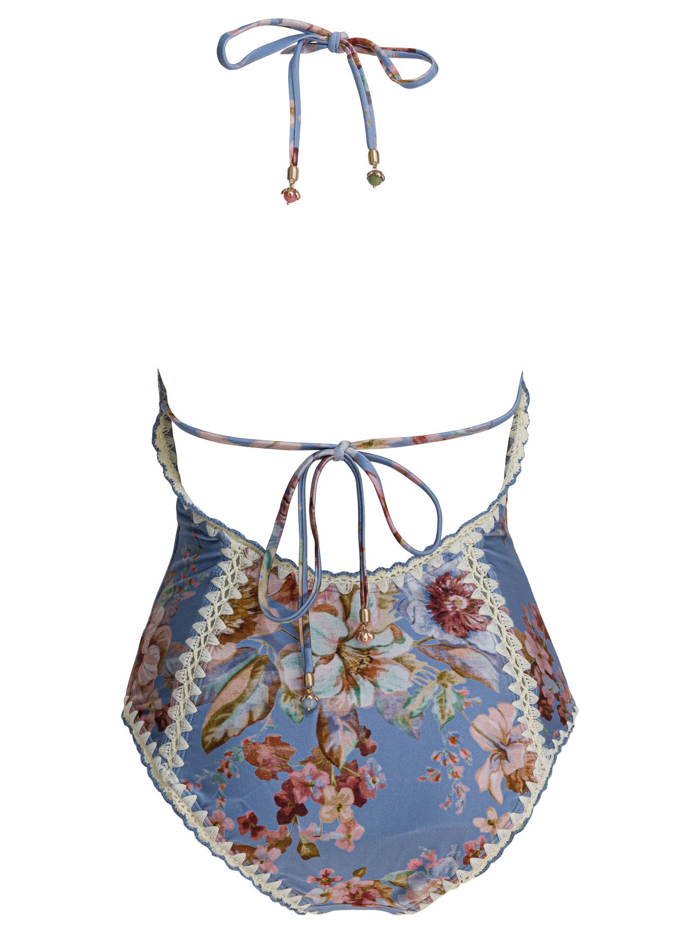 The halter neckline with adjustable tie closure offers customizable support, while the alluring keyhole cutout at the center front adds a touch of sophistication. Delicate crochet trim detailing frames the silhouette, showcasing Zimmermann's signature attention to craftsmanship and detail.