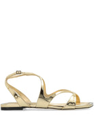 Elevate your warm-weather wardrobe with the Ayla Flat from Jimmy Choo. This luxurious strappy sandal features a sleek metallic gold finish and delicate crossover straps that elegantly frame the foot, secured with an adjustable ankle strap for the perfect fit.