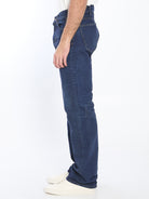 DARK BLUE COTTON DENIM JEANS. THEY FEATURE A BUTTON CLOSURE, BELT LOOPS, FIVE POCKETS, WIDE LEGS, AND A BROWN LEATHER PATCH ON THE BACK.