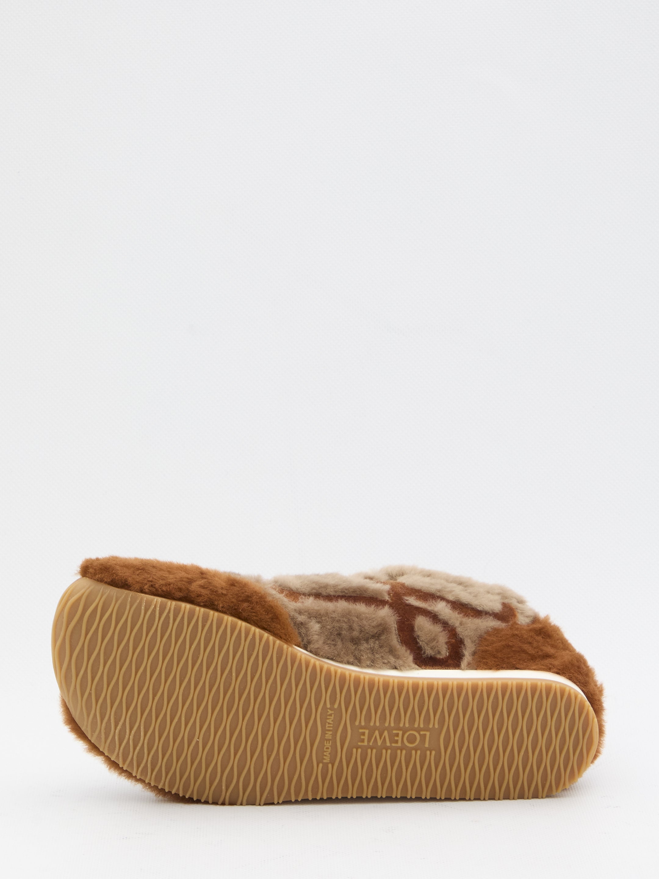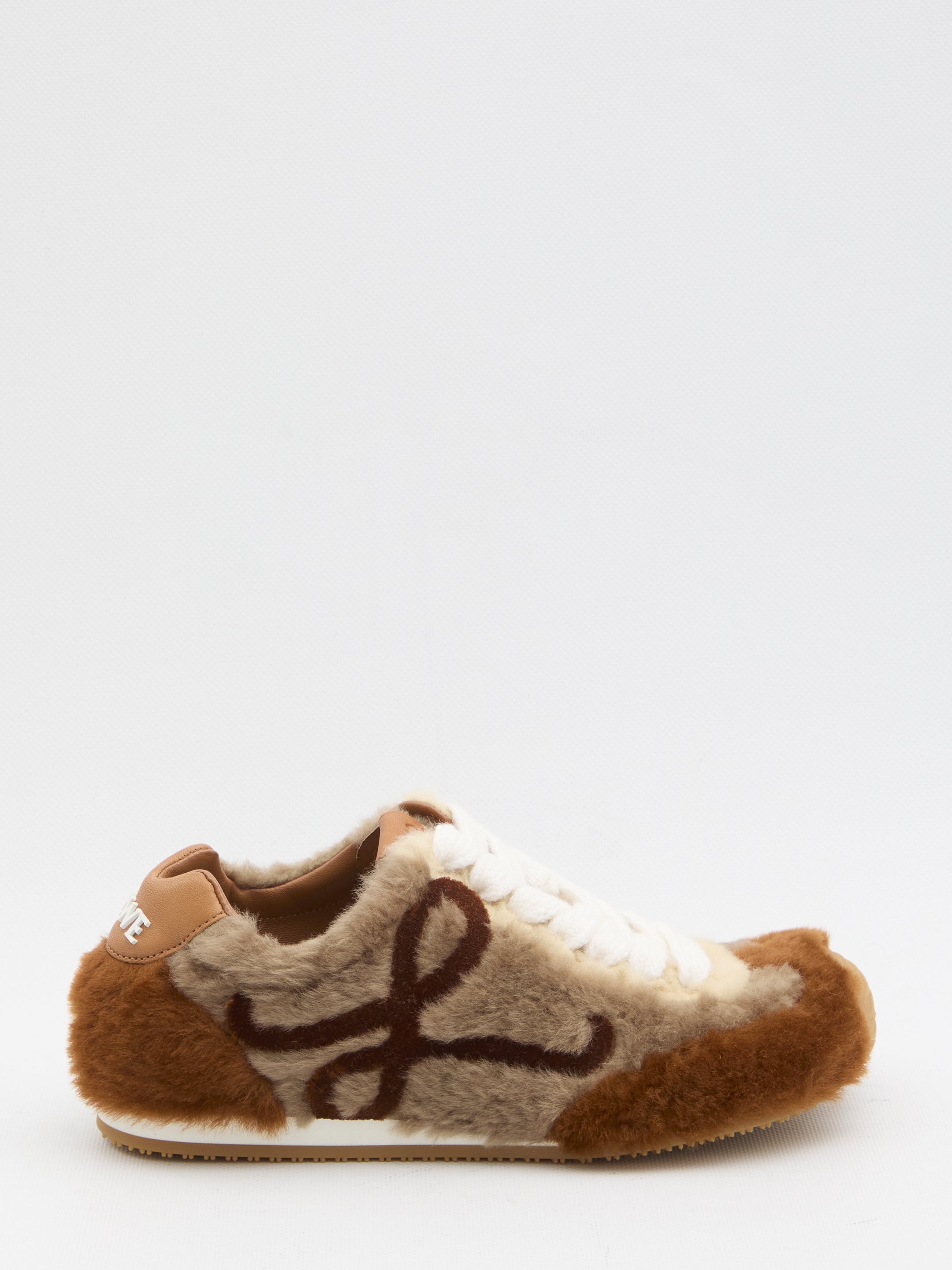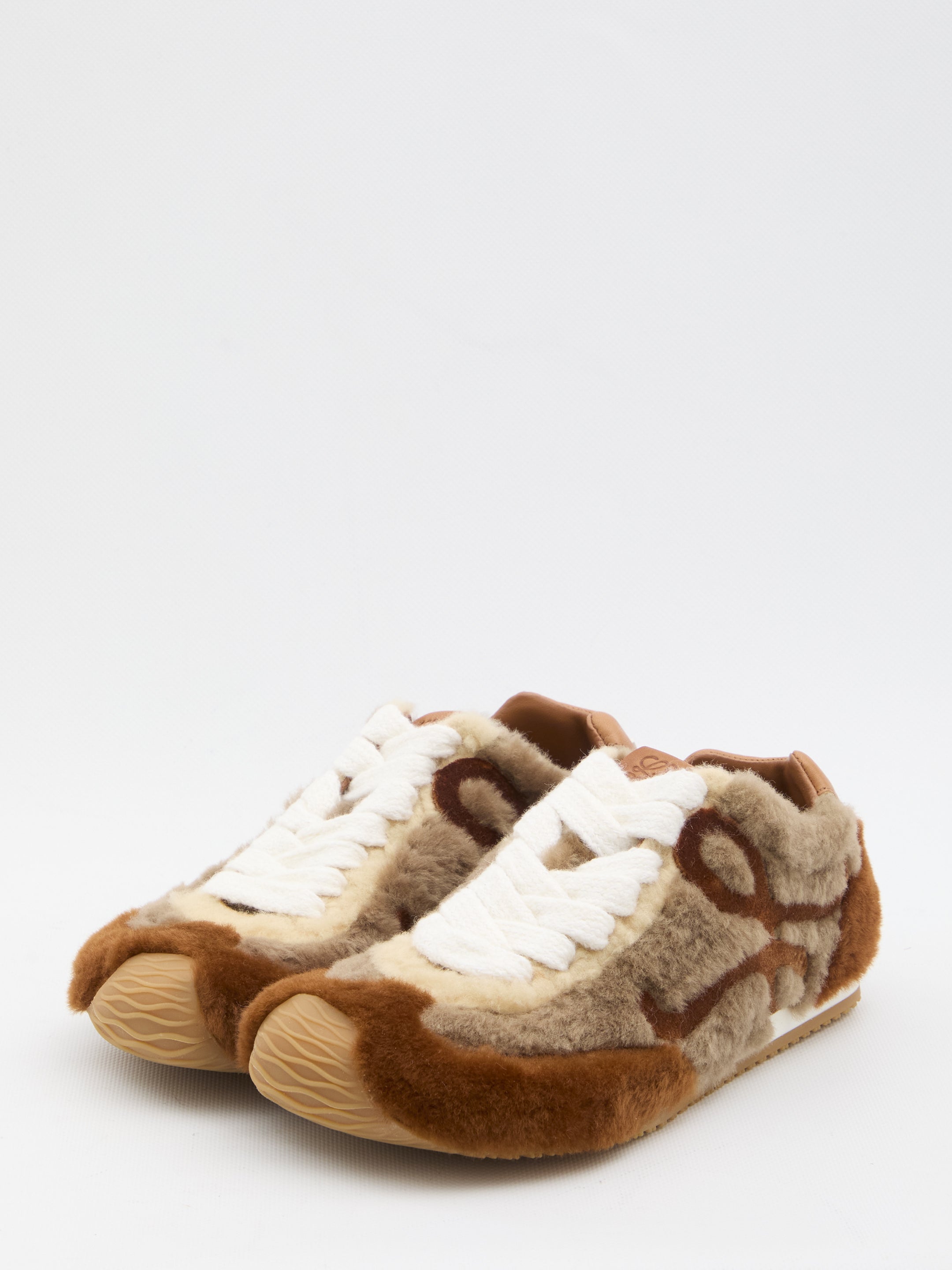 Ballet Runner 2.0 sneakers in shearling with leather inserts in brown and grey tones. Featuring an asymmetrical rounded toe, sock-style inner construction, lightweight rubber sole, lace-up fastening, L monogram on the side, embossed Anagram motif on the tongue, and injected rubber LOEWE detail on the back tongue.