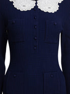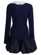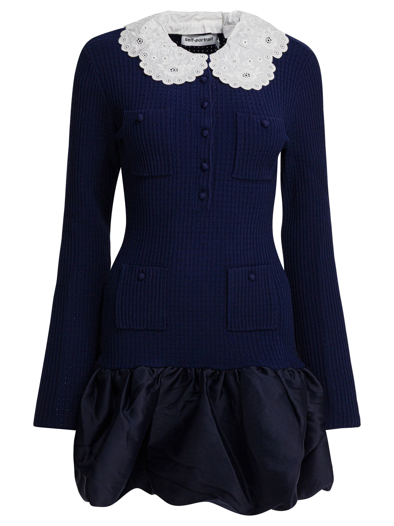 Self-Portrait balloon skirt dress, constructed by combining perforated mesh and taffeta element at the bottom. The garment features a flared silhouette with a mini-dress structure. Contrasting sangallo lace collar, sharp seams and balloon hemline define the line. Front button closure. The main knit offers stretch and tightness, enhancing the garment's construction.