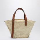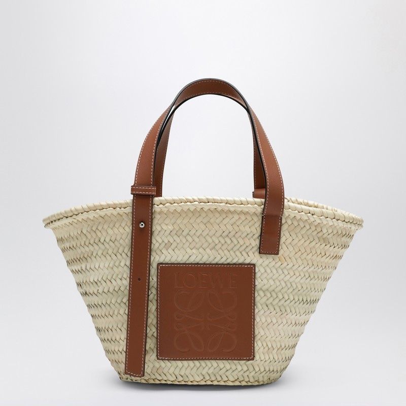 Elevate your everyday style with this exquisite LOEWE Basket Bag, masterfully crafted from natural palm leaf and luxurious brown calfskin leather. This artisanal piece features two adjustable top handles for comfortable carrying and showcases the brand's signature embossed anagram logo on a leather patch at the front.