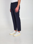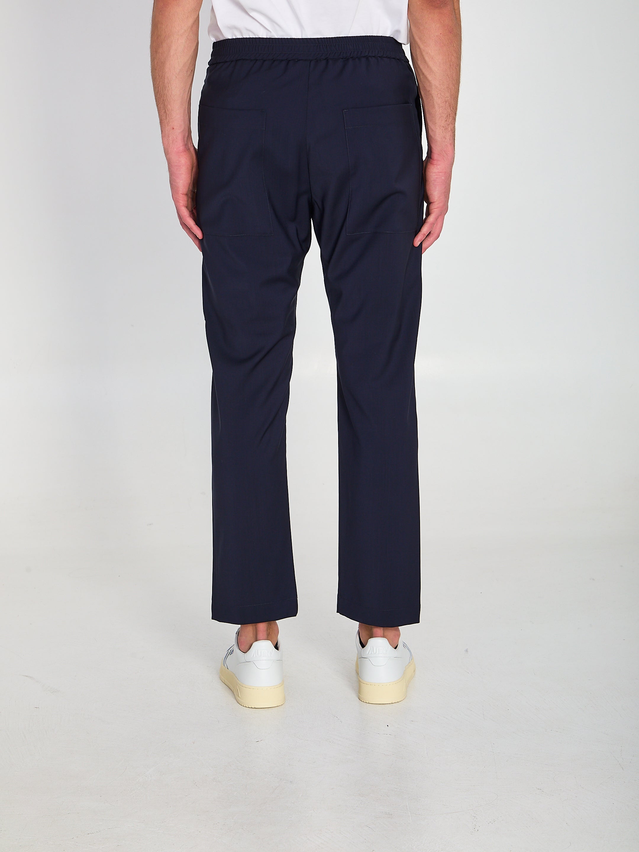 NAVY BLUE LIGHTWEIGHT VIRGIN WOOL TROUSERS. FEATURE AN ELASTICIZED WAIST WITH A DRAWCORD, TWO IN-SET SIDE POCKETS, TWO PATCH BACK POCKETS, A LOW-RISE WAIST, AND A STRAIGHT LEG. REGULAR FIT.
