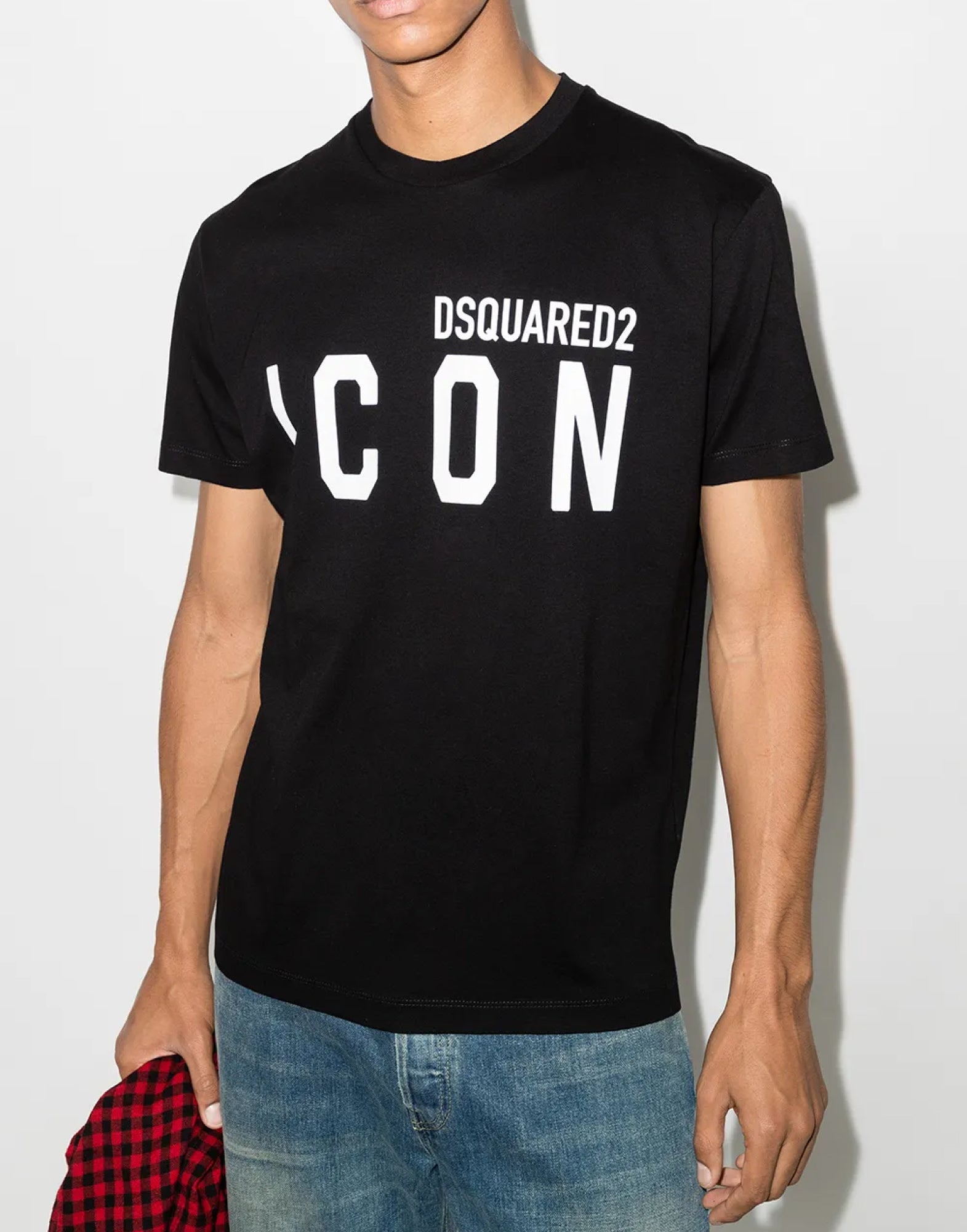 Make a bold statement with the DSQUARED2 BE ICON Logo T-Shirt. This striking black tee features the brand's signature "ICON" graphic prominently displayed across the chest in crisp white lettering, creating an eye-catching contrast that embodies contemporary streetwear style.