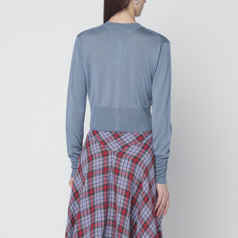 The cropped silhouette creates a flattering, modern proportion that pairs beautifully with high-waisted trousers, skirts, or denim. Featuring a classic crew neckline and button-front closure with the signature Vivienne Westwood orb detail, this cardigan effortlessly transitions from office to weekend.