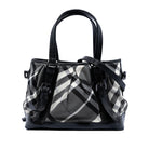 This satchel features a nylon body with patent leather trim, flat patent leather handles, a detachable and adjustable patent leather shoulder strap with leather guard, a top zip closure, and interior zip, slip and open pockets.