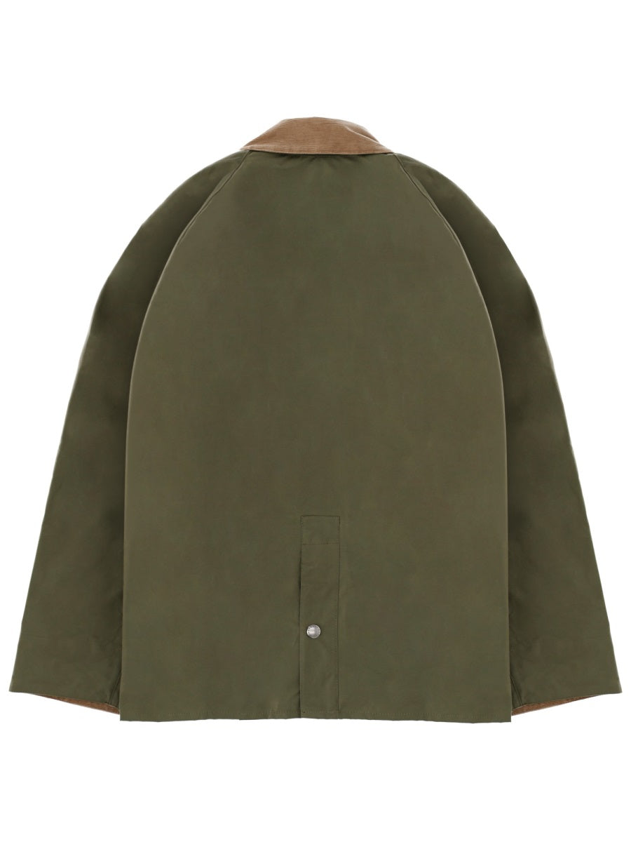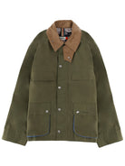 The Bedale Paul Smith x Barbour Jacket is a distinguished collaboration between two iconic British brands, bringing together Barbour's heritage outerwear expertise with Paul Smith's signature style. This field jacket features a classic olive green cotton body with a distinctive brown corduroy collar, multiple utility pockets, and snap-button closures with blue contrast piping details.