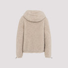 The relaxed bomber silhouette features a practical drawstring hood, front zip fastening, and adjustable drawstring cuffs for a customizable fit. A signature logo patch adorns the chest pocket, adding an unmistakable designer touch.