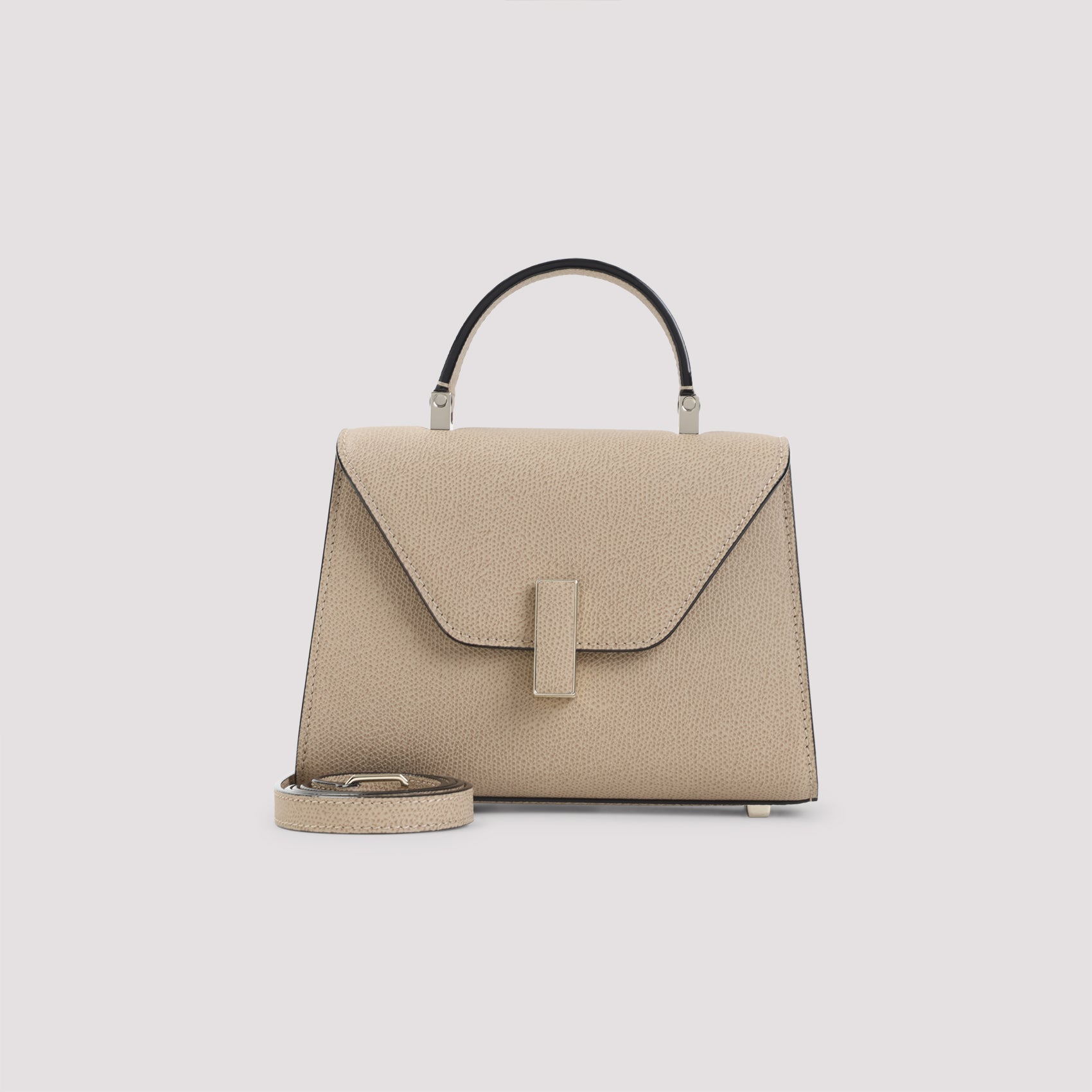 VALEXTRA BEIGE CACHEMIRE MINE ISIDE CROSSBODY MICRO BAG. BEIGE CACHEMIRE MINE LEATHER, GOLDEN-TONE CLASP CLOSURE WITH A LEATHER INSERT. TONAL DETACHABLE AND ADJUSTABLE STRAP, SIGNATURE BLACK LACQUERED COSTA EDGES PAINTED BY HAND. HANDLE ON TOP, GOLDEN-TONE HARDWARE. FULLY LINED.
