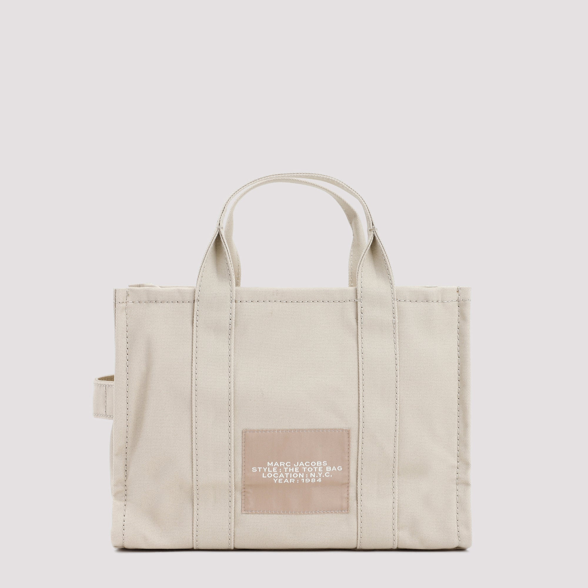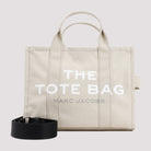 MARC JACOBS BEIGE COTTON THE MEDIUM TOTE BAG. BEIGE COTTON, TOP ZIP FASTENING, HANDLE ON TOP. ADJUSTABLE CROSSBODY BLACK WEBBING STRAP, 1 INTERIOR ZIP POCKET, 2 SLIP POCKETS, 1 CARD SLOT. FULLY LINED, THE TOTE BAG PRINTED ON FRONT IN CONTRASTING WHITE.