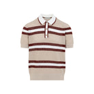 DRIES VAN NOTEN MERCY BEIGE VISCOSE POLO. CRAFTED FROM BEIGE, WHITE AND BURGUNDY VISCOSE MESH, FEATURING A STRIPED PATTERN, A CONTRASTING WHITE COLLAR, FRONT BUTTON FASTENING, SHORT SLEEVES, AND RIBBED EDGES.