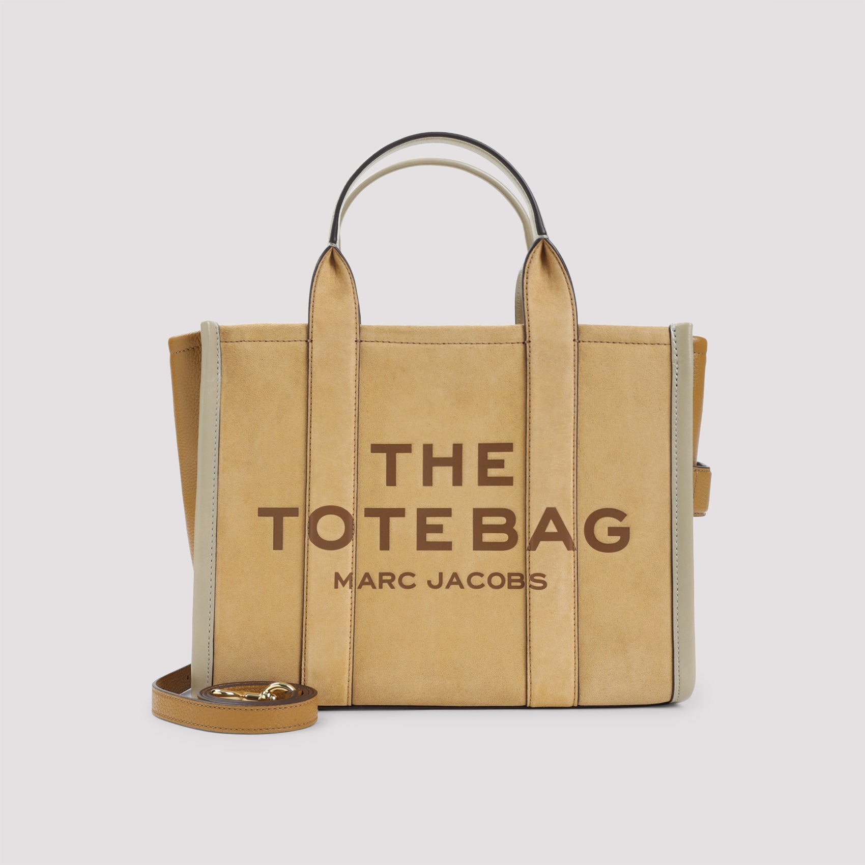 MARC JACOBS THE MEDIUM BEIGE SUEDE LEATHER TOTE BAG. CRAFTED FROM BEIGE SUEDE LEATHER WITH IVORY LEATHER TRIM AND DETAILS, FEATURING TWO TOP HANDLES, A ZIP FASTENING, THE SIGNATURE AND `THE TOTE BAG` EMBOSSED ON THE FRONT, AN ATTACHABLE AND ADJUSTABLE SHOULDER STRAP, AN INNER ZIP POCKET, TWO SLIP POCKETS AND A CARD SLOT.