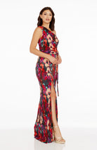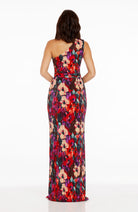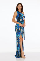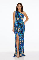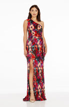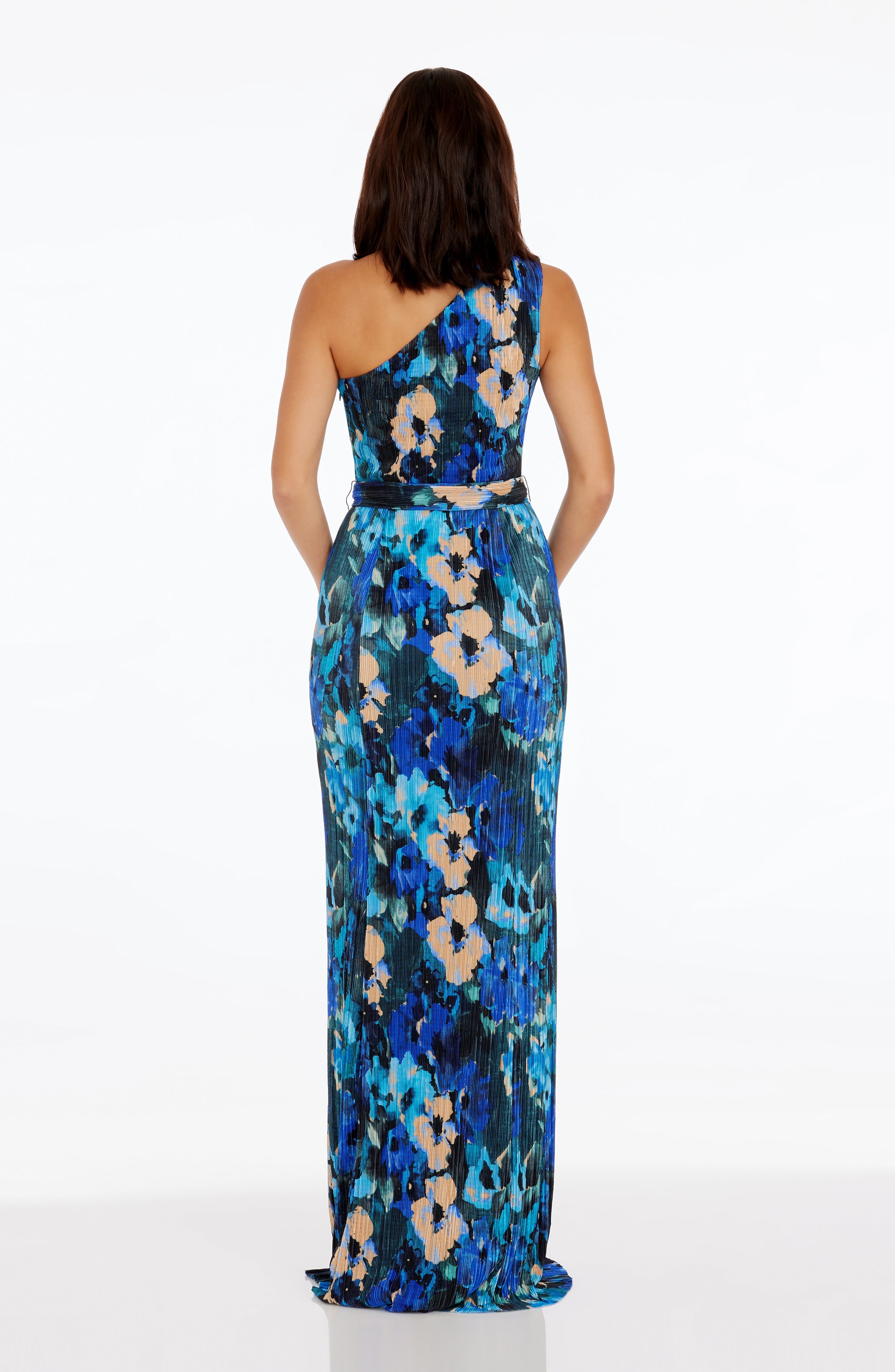 This exquisite floor-length dress features a sleeveless one shoulder design with side rouching and a waist tie for a flattering silhouette.