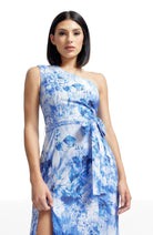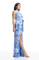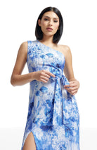 This best-selling sleeveless maxi dress features one shoulder design, side ruching, a high slit, and a waist tie. Created in a stretch plisse knit fabric, the Bella is lightweight, comfortable, and flattering.