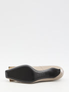 Beige patent leather pumps. Featuring a square toe, covered slim Trompette heel, and signature square metal buckle with logo. Any imperfections in the leather are not to be considered manufacturing defects, but rather a characteristic of the material.