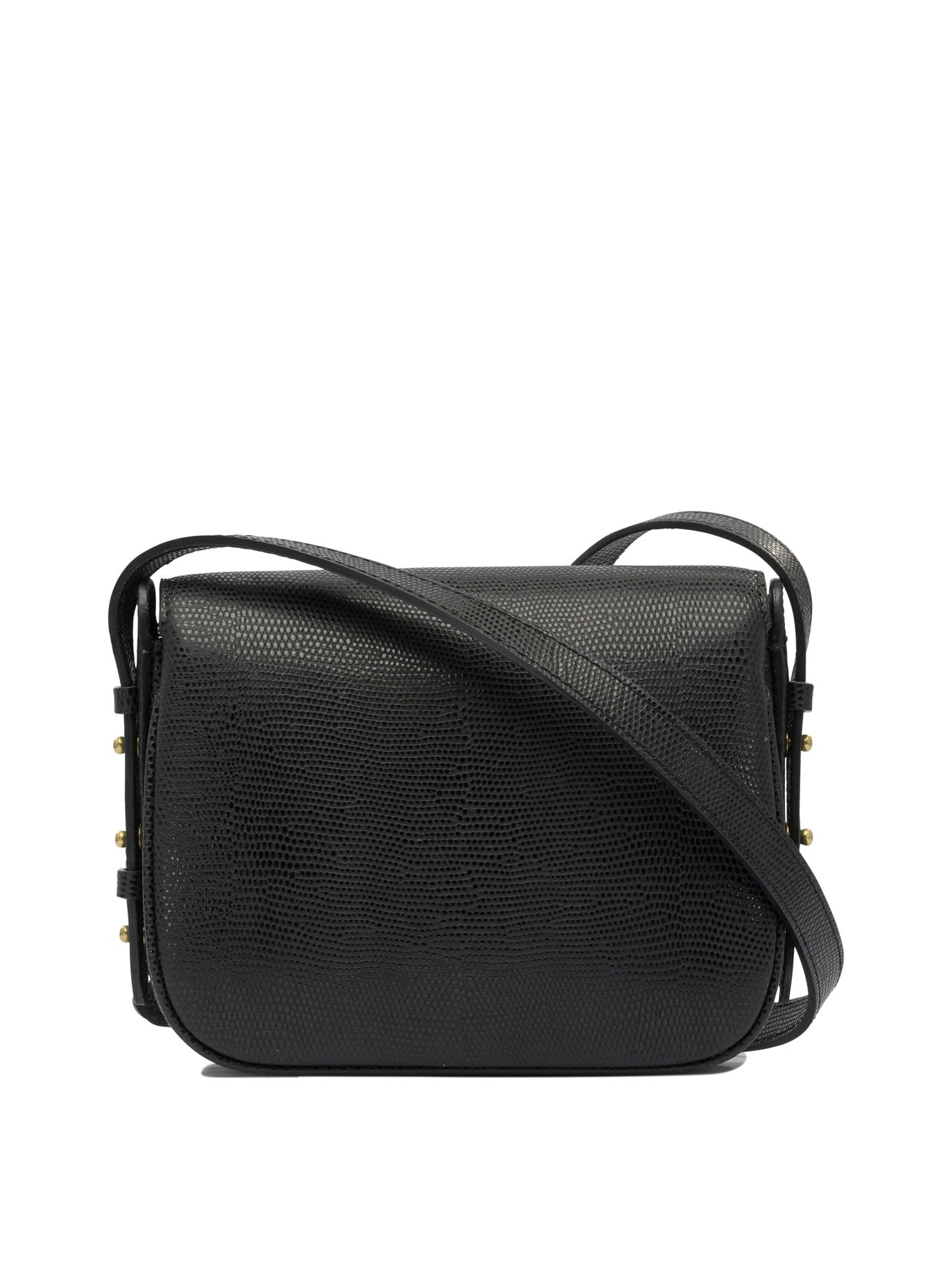 Soeur "Bellissima" shoulder bag made of smooth-surface LWG leather. Compact structure features a defined rectangular silhouette with front flap and integrated gold monogram clasp. Adjustable shoulder strap designed for dual use as both shoulder and crossbody. Three interior compartments organize the space, finished with a fine-weave cotton lining and metallic parts with golden finish.