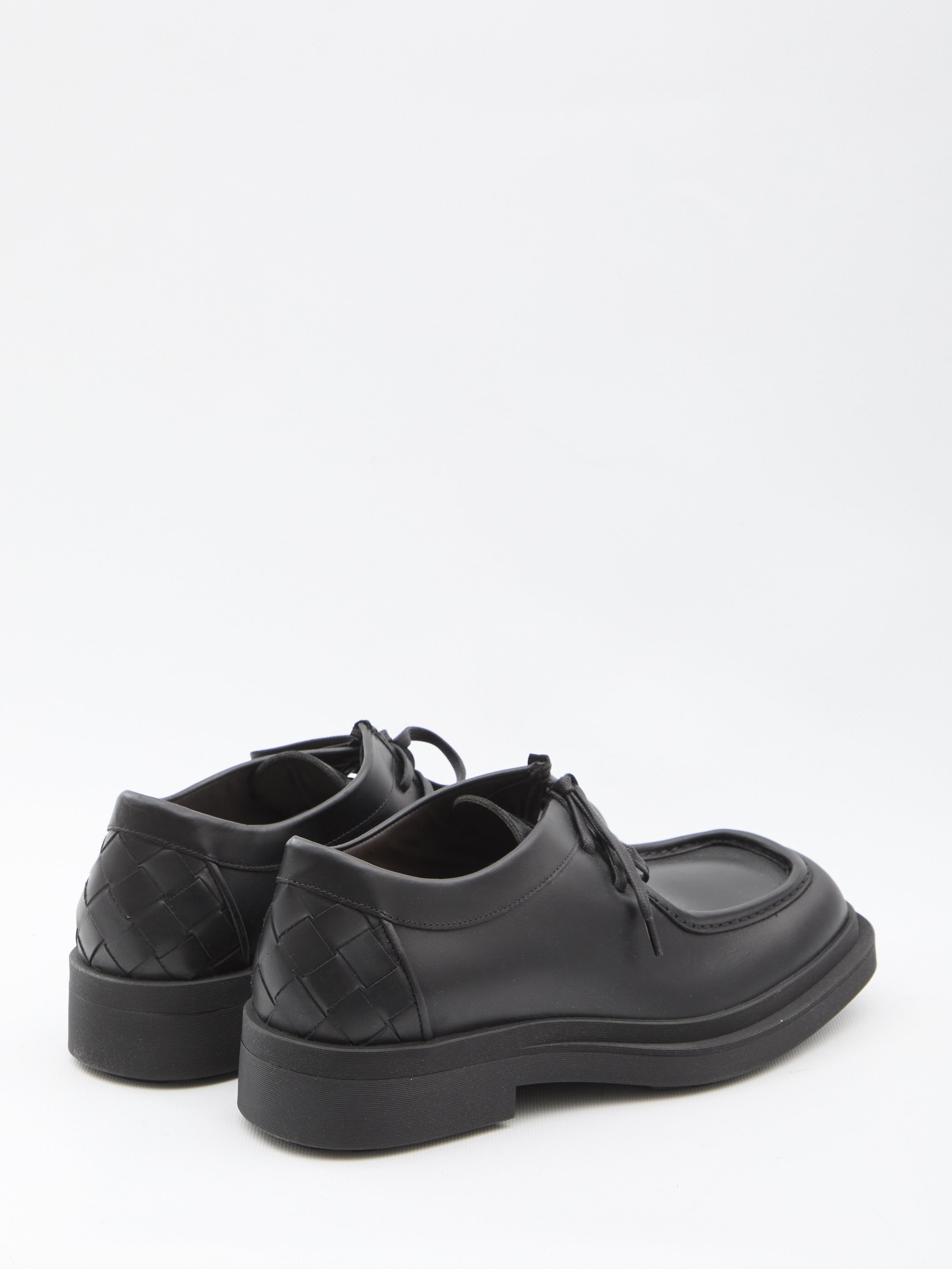 Elevate your footwear collection with the Ben Lace-Up Shoes from Bottega Veneta. Crafted in luxuriously soft black calfskin leather, these sophisticated shoes feature a modern square toe and the brand's signature Intrecciato motif at the rear counter.