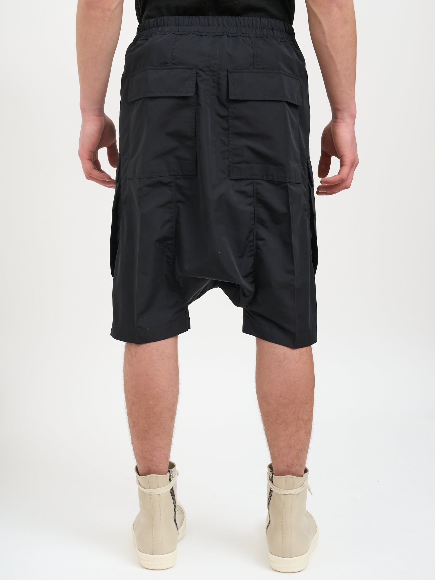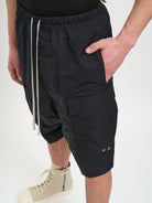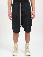 Elevate your streetwear game with the Bermuda Cargo Pods from Rick Owens. These distinctive black shorts feature the designer's signature drop-crotch silhouette with functional cargo pockets on the sides and back.