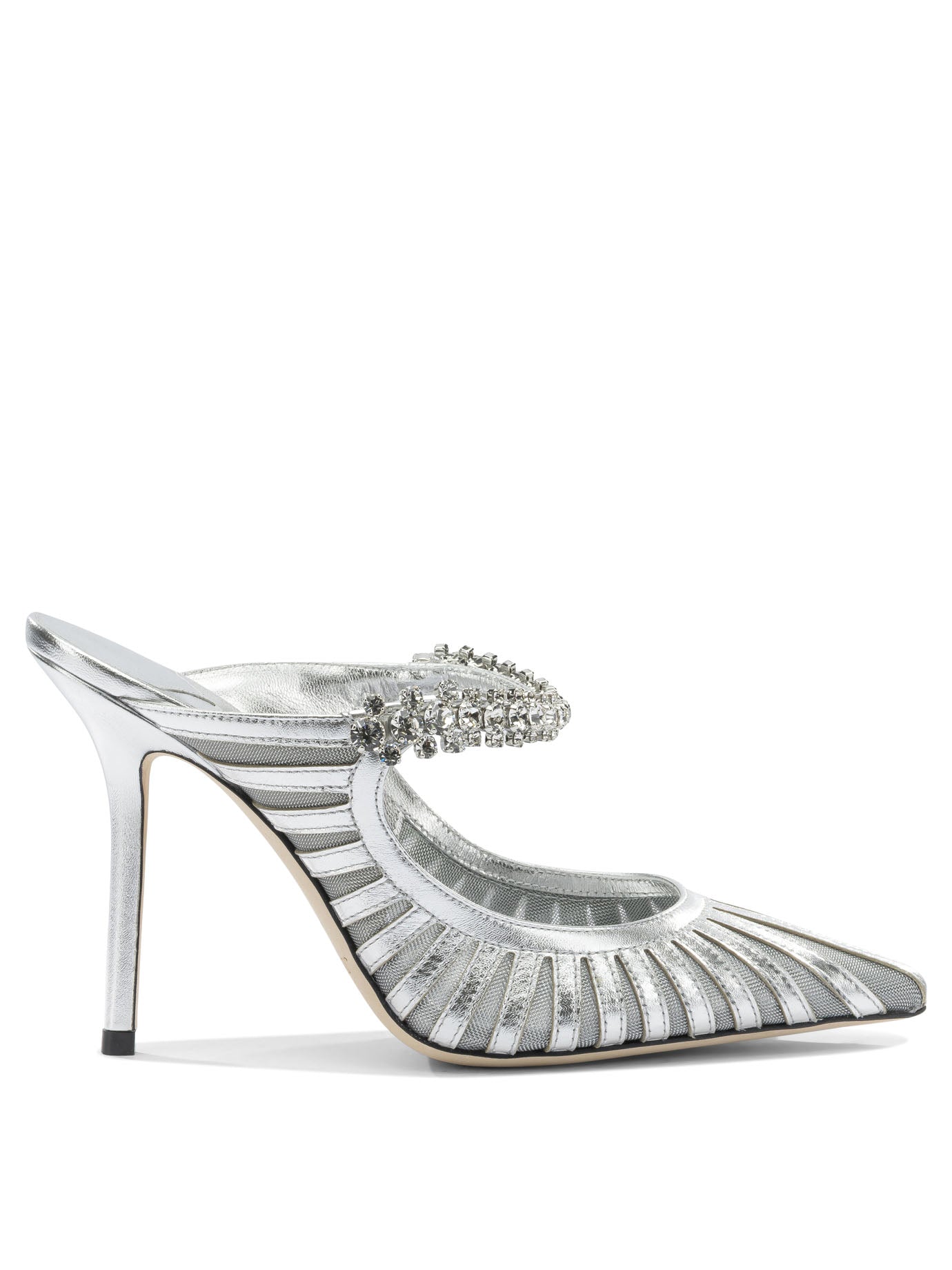 Elevate your evening ensemble with the "Bing" 100mm mules from Jimmy Choo, a stunning fusion of sophistication and glamour. Crafted from luxurious leather with a tapered silhouette and elongated toe, these backless heels feature a dazzling crystal-embellished strap that catches the light with every step.