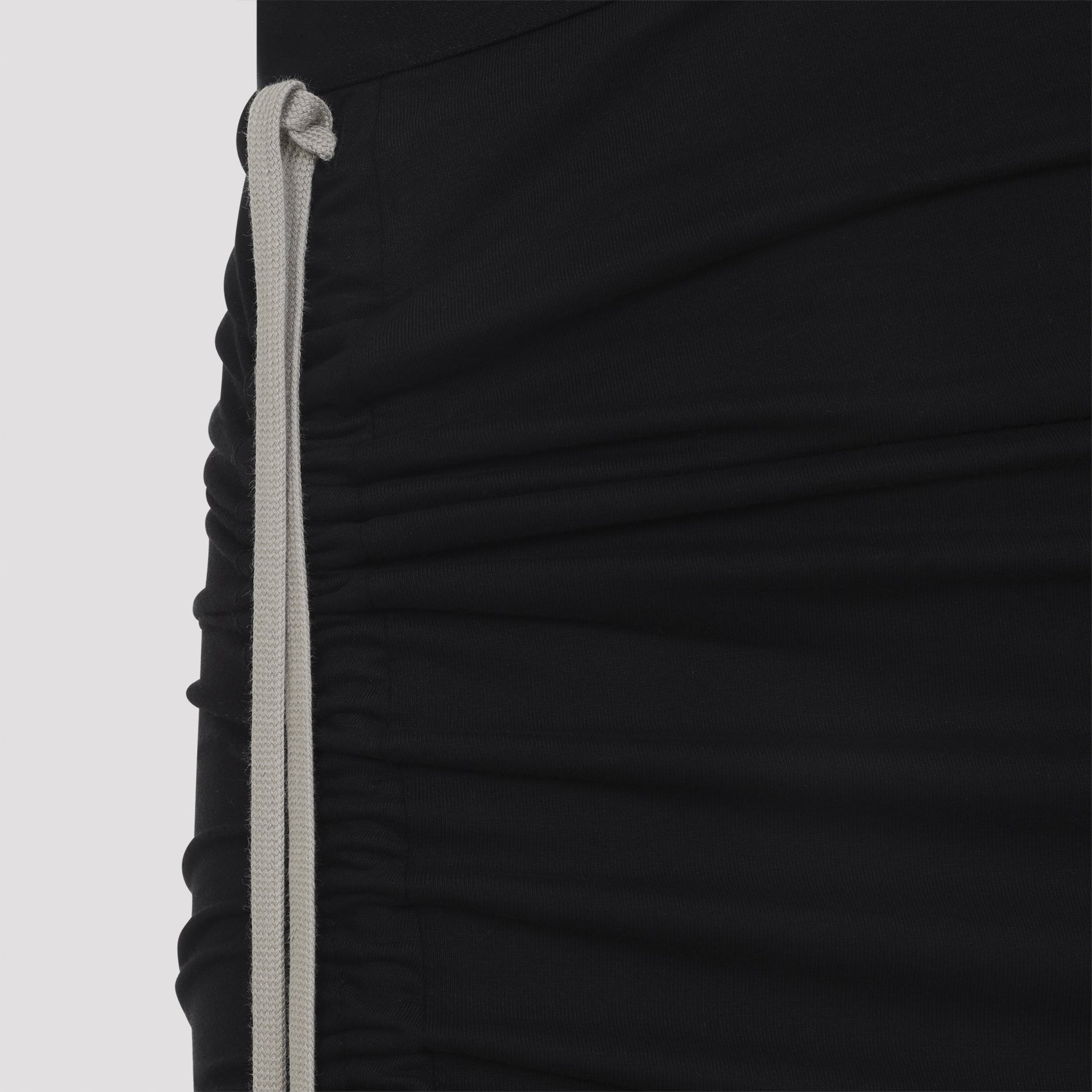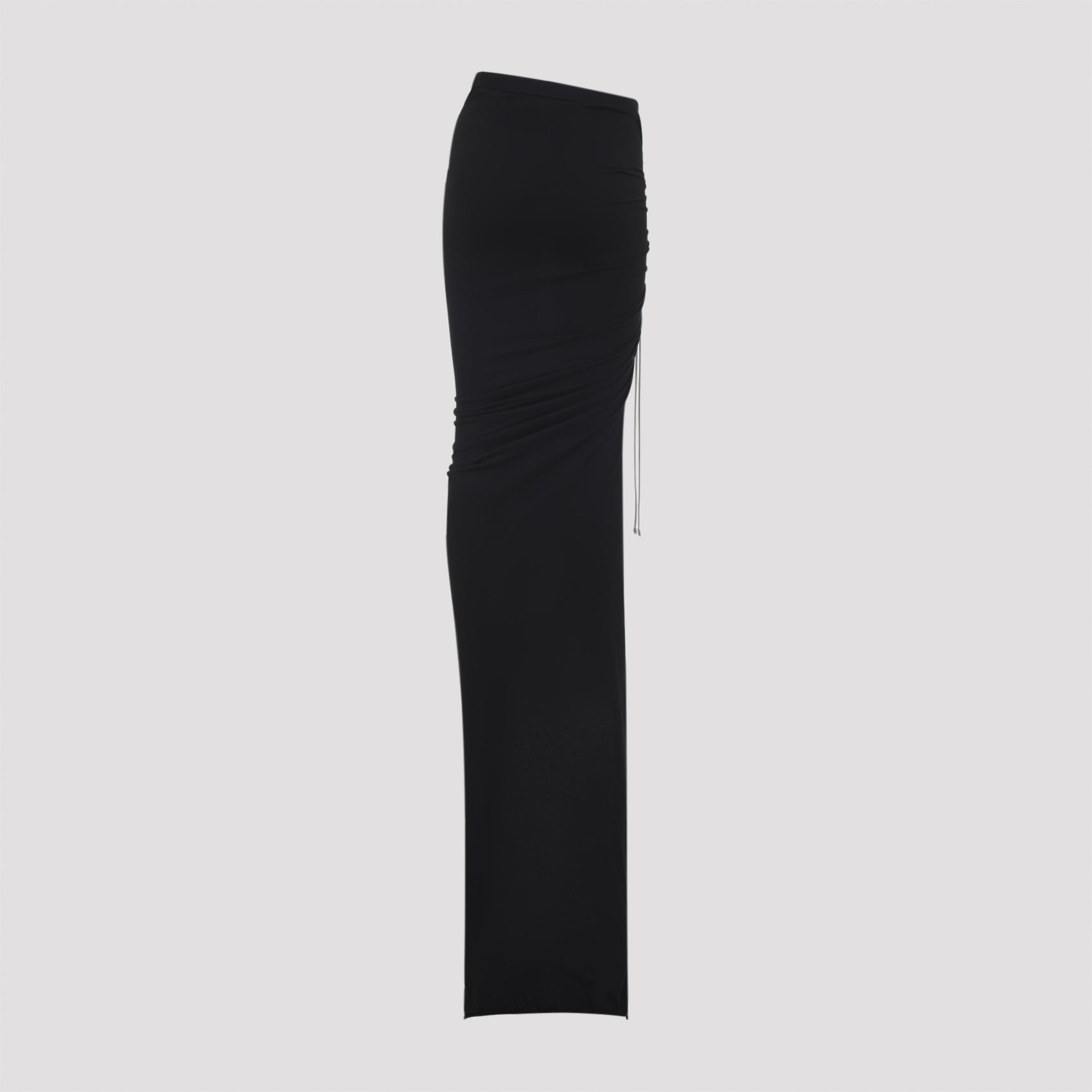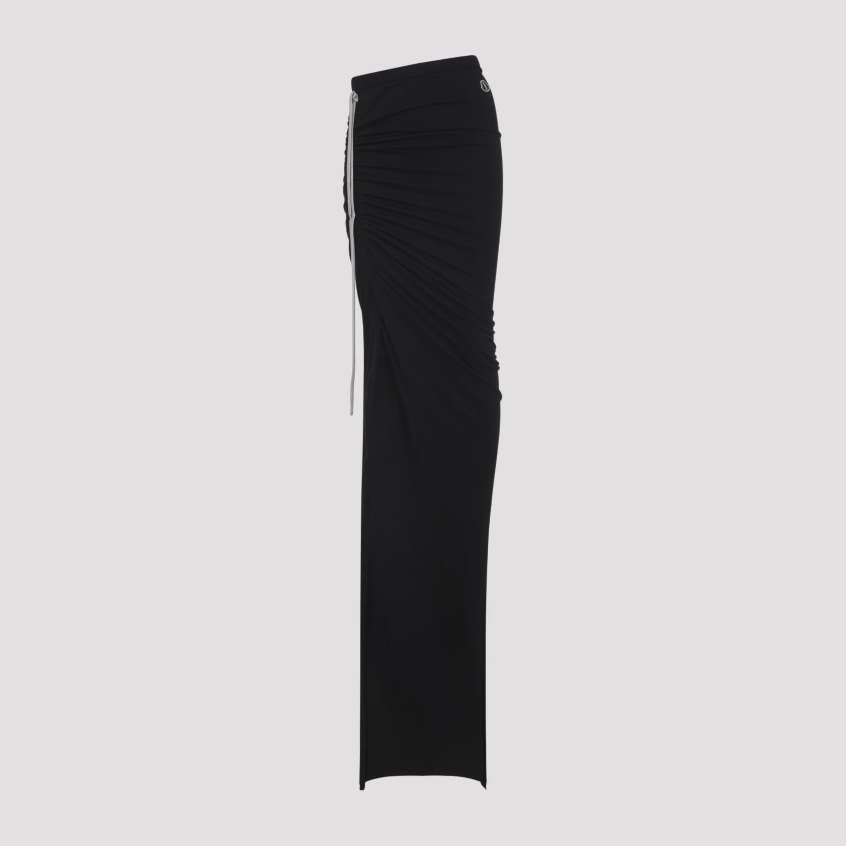 MONCLER X RICK OWENS BLACK ADJUSTABLE SKIRT. BLACK MEDIUM-WEIGHT COTTON JERSEY TRAILS FLOOR LENGTH, SLIT ON THE RIGHT LEG. ELASTICIZED WAISTBAND AND A SLIM FIT. DRAPES AND WRAPS AROUND THE HIPS, AND GATHERS INTO A SEAM ON THE RIGHT THIGH. SIDE SPLIT CAN BE MODIFIED USING THE DRAWSTRING. HIGHER, OR LOWER, SPLIT CREATES INCREASED DRAPING AND RUCHING. TRAIN LAYS FLOOR LENGTH TO THE LEFT. MONCLER + RICK OWENS EMBROIDERED LOGO PATCH ON THE LEFT HIP.