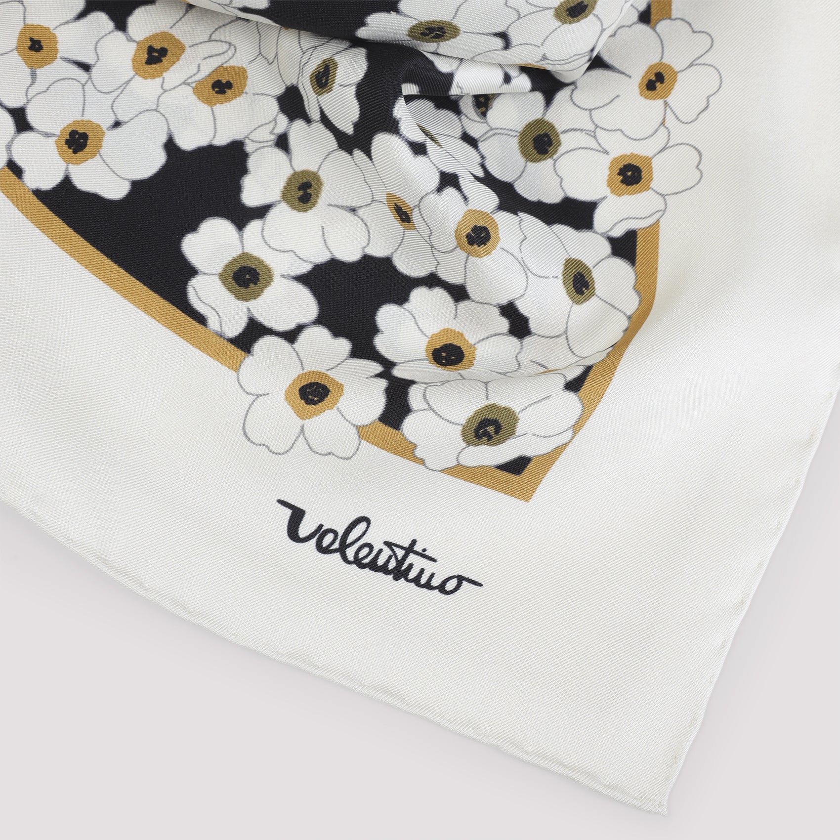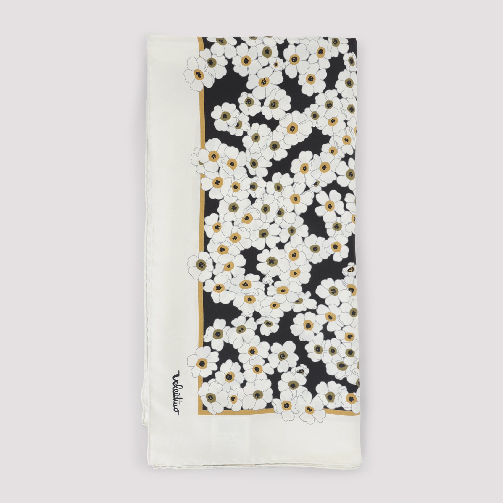 VALENTINO GARAVANI BLACK AND IVORY SILK SCARF. CRAFTED FROM PURE SILK IN IVORY AND BLACK, FEATURING A SIGNATURE FLORAL PRINT, AND LOGO AT THE EDGE.