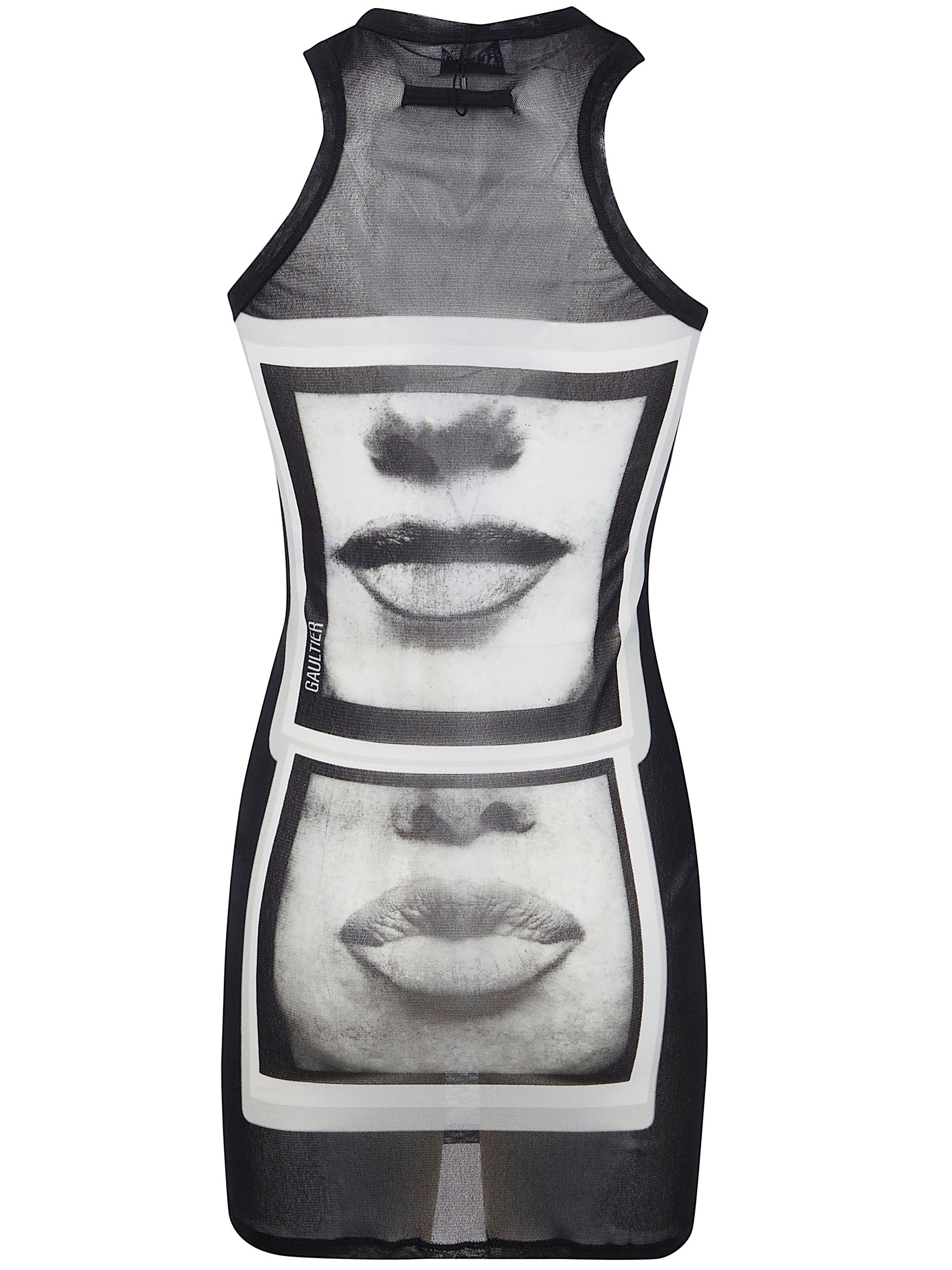 JEAN PAUL GAULTIER EYES AND LIPS BLACK AND WHITE POLYAMIDE MINI DRESS. CRAFTED FROM BLACK AND WHITE MESH, FEATURING “EYES AND LIPS” SIGNATURE PRINT ALL OVER, A HALTER NECK, A STRAIGHT HEM, AND A SLIM FIT.