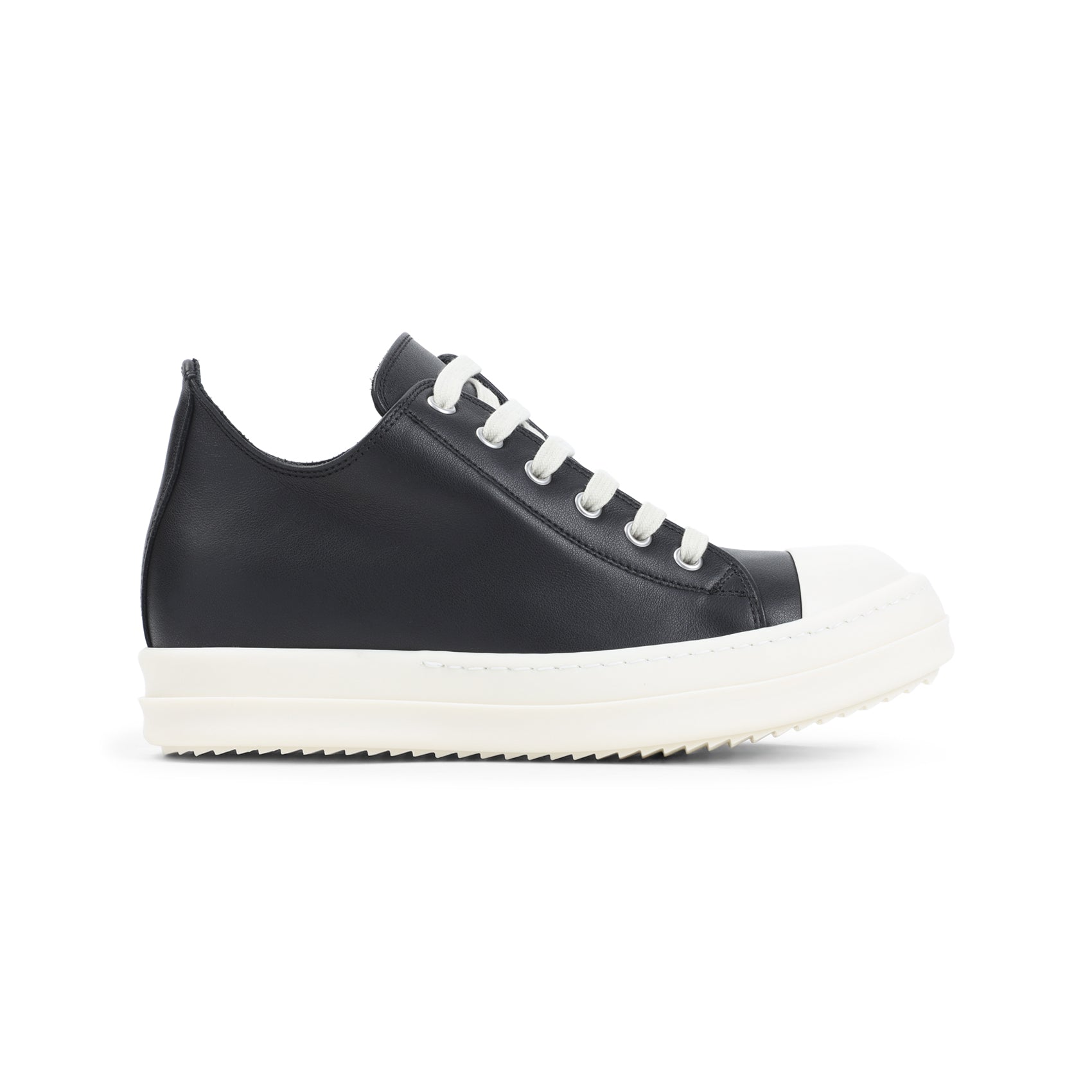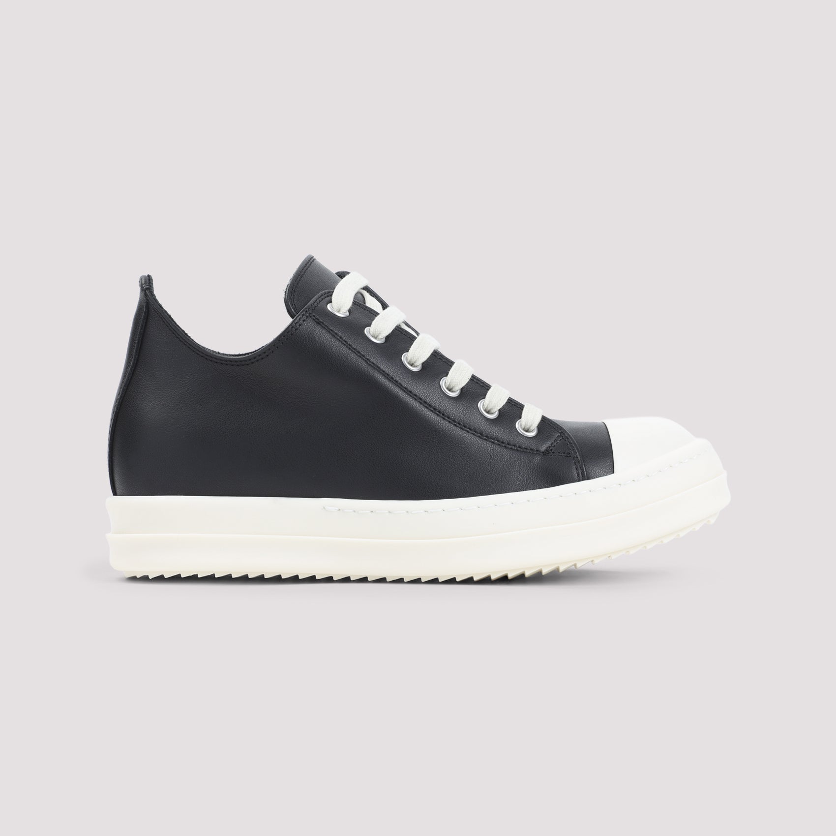 RICK OWENS LOW BLACK AND WHITE LEATHER SNEAKERS. CRAFTED FROM BLACK LEATHER, FEATURING A ROUND TOE, LACE-UP FASTENING, SILVER-TONED METAL EYELETS AT THE INNER SIDES, LEATHER LINING AND INSOLE, AND A CHUNKY WHITE RUBBER SOLE.