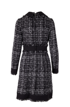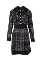 Elevate your wardrobe with this striking black and white tweed dress, designed for refined elegance. The contrast spread collar frames the neckline beautifully, while the decorated button placket adds a distinctive focal point to the front. A convenient back zip closure ensures effortless dressing, and delicate fringe trim along the hem introduces subtle movement and texture. Perfect for upscale occasions, this piece combines timeless tweed craftsmanship with modern design details. Dry clean for best results.