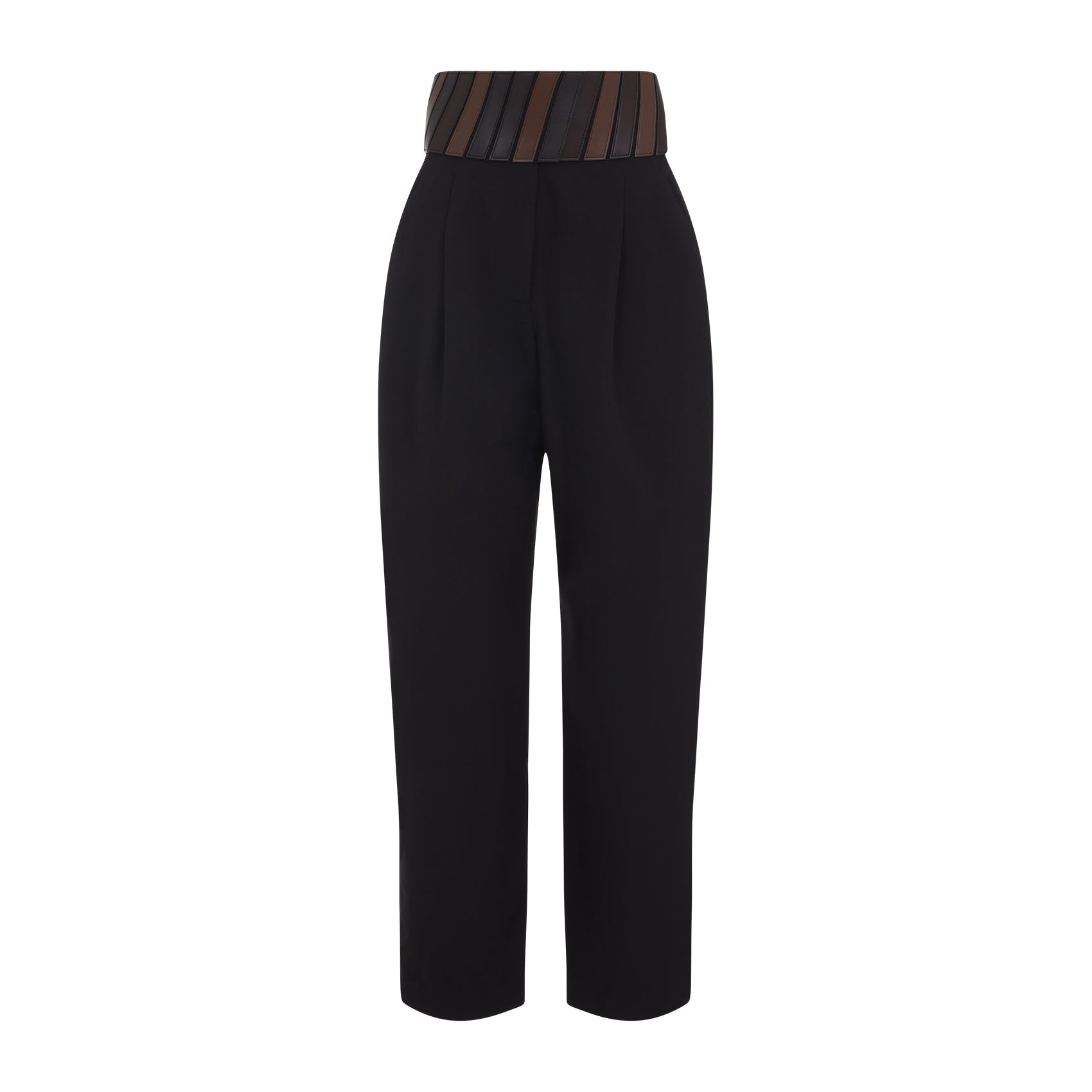 ALAÏA BELT BLACK WOOL PANTS. HIGH-WAIST PANTS CRAFTED FROM BLACK WOOL GABARDINE, FEATURING A LEATHER BELT, A CONCEALED ZIP AND BUTTON FASTENING, FRONT DARTS, TWO SIDE POCKETS, ONE WELT POCKET, AND STRAIGHT LEG.