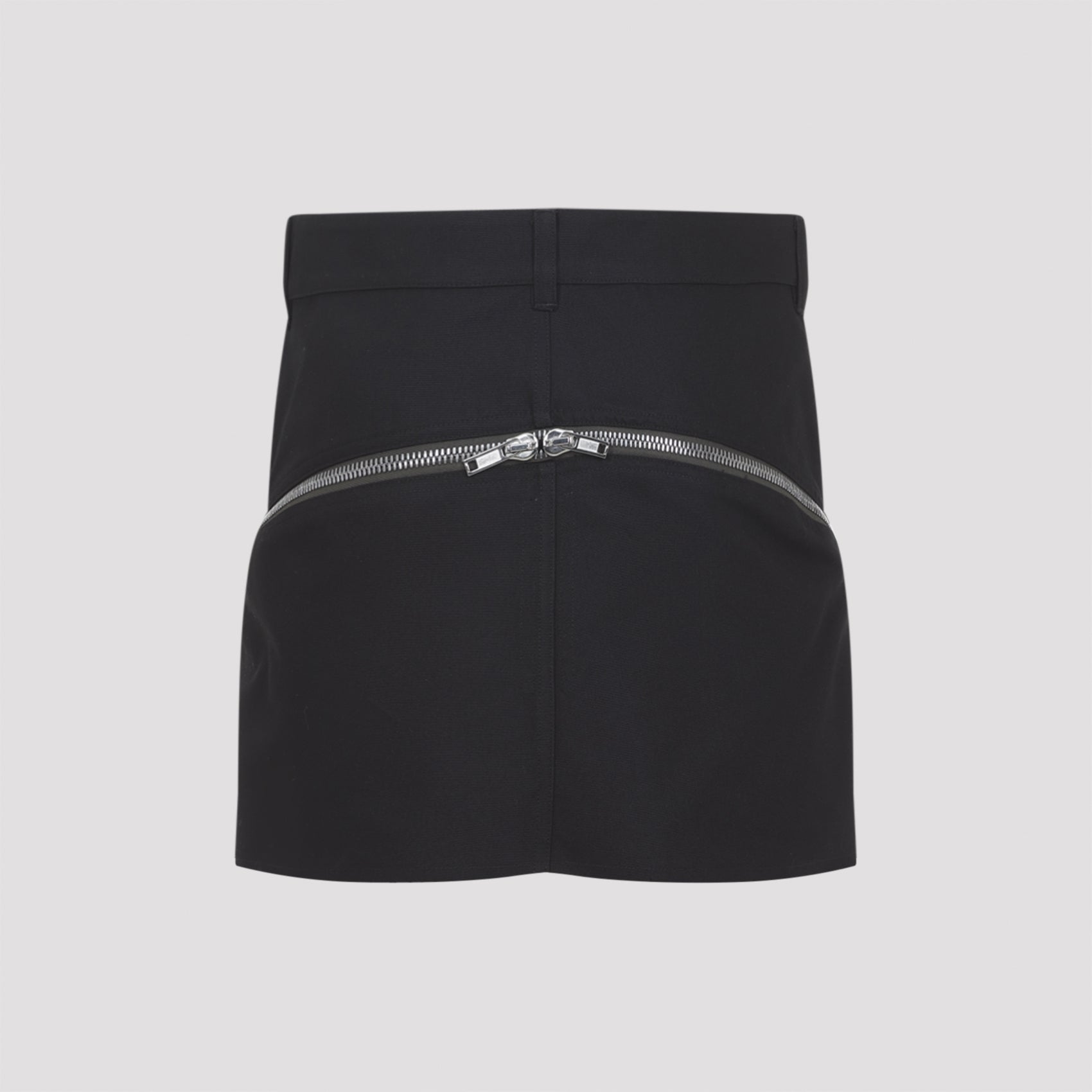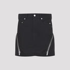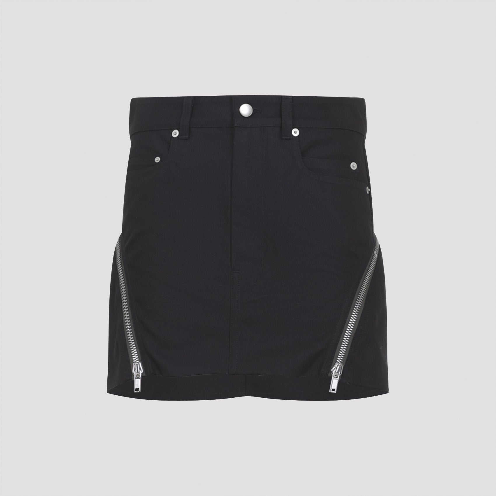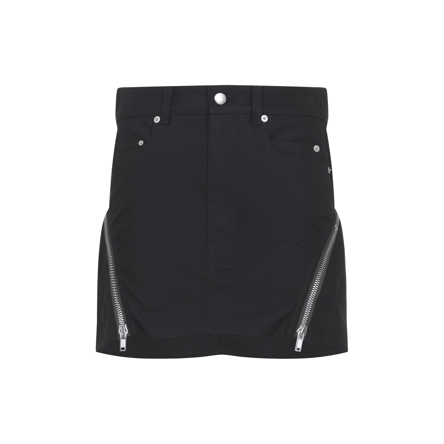 RICK OWENS BOLAN BANANA BLACK COTTON MINI SKIRT. HIGH-WAIST SKIRT CRAFTED FROM BLACK COTTON, FEATURING THE ICONIC SIX-POCKET CONSTRUCTION, BELT LOOPS, A FRONT BUTTON FLY, A BACK ZIP EXTENDING TO THE HIPS, AND A RAW-CUT HEM.