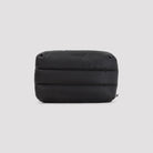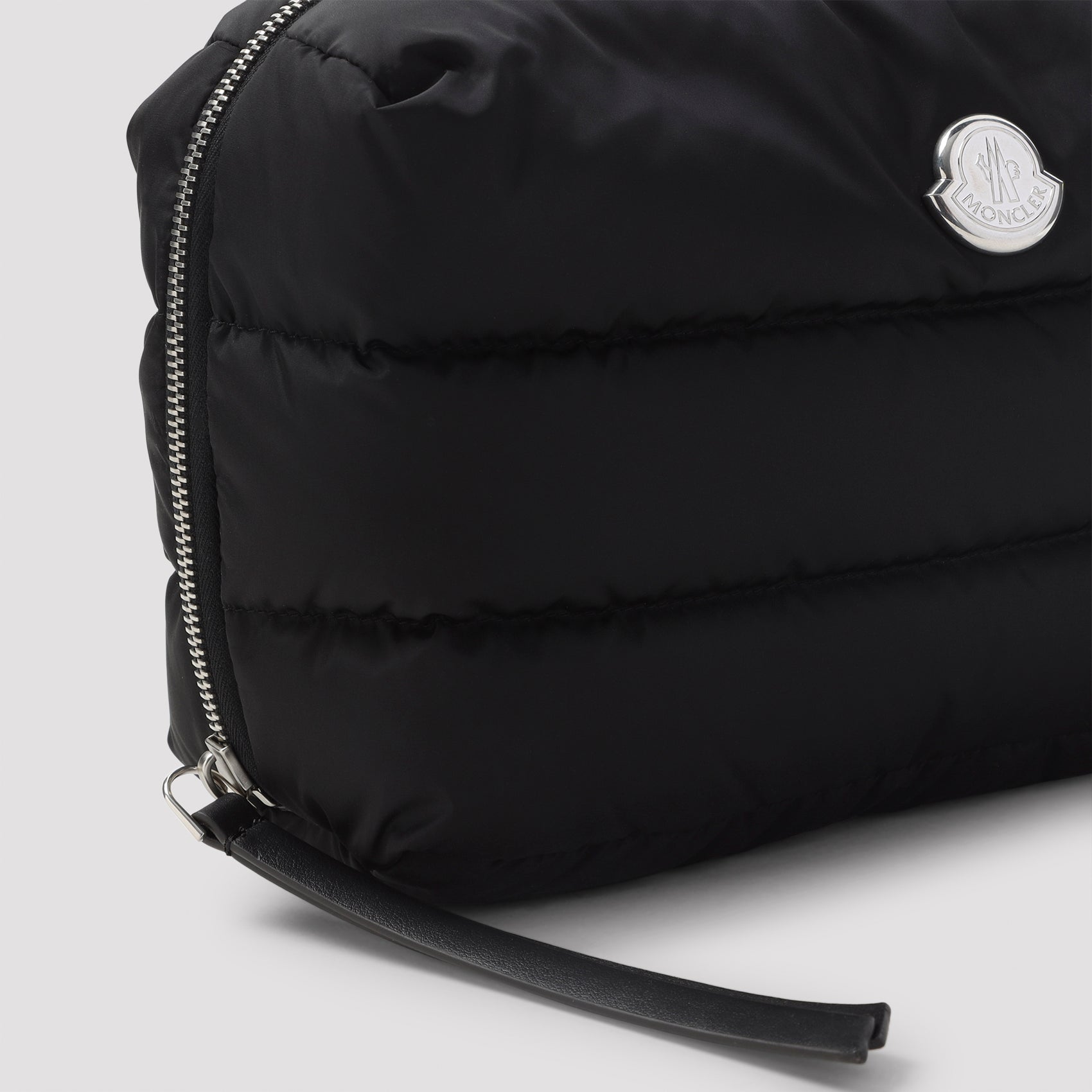 MONCLER CARADOC BLACK POLYAMIDE WASH BAG. CRAFTED FROM PADDED BLACK TECH FABRIC, FEATURING A QUILTED PATTERN, SILVER-TONED HARDWARE, A TOP ZIP FASTENING, A FRONT METAL LOGO, AN INNER POCKET, AND A LINING.