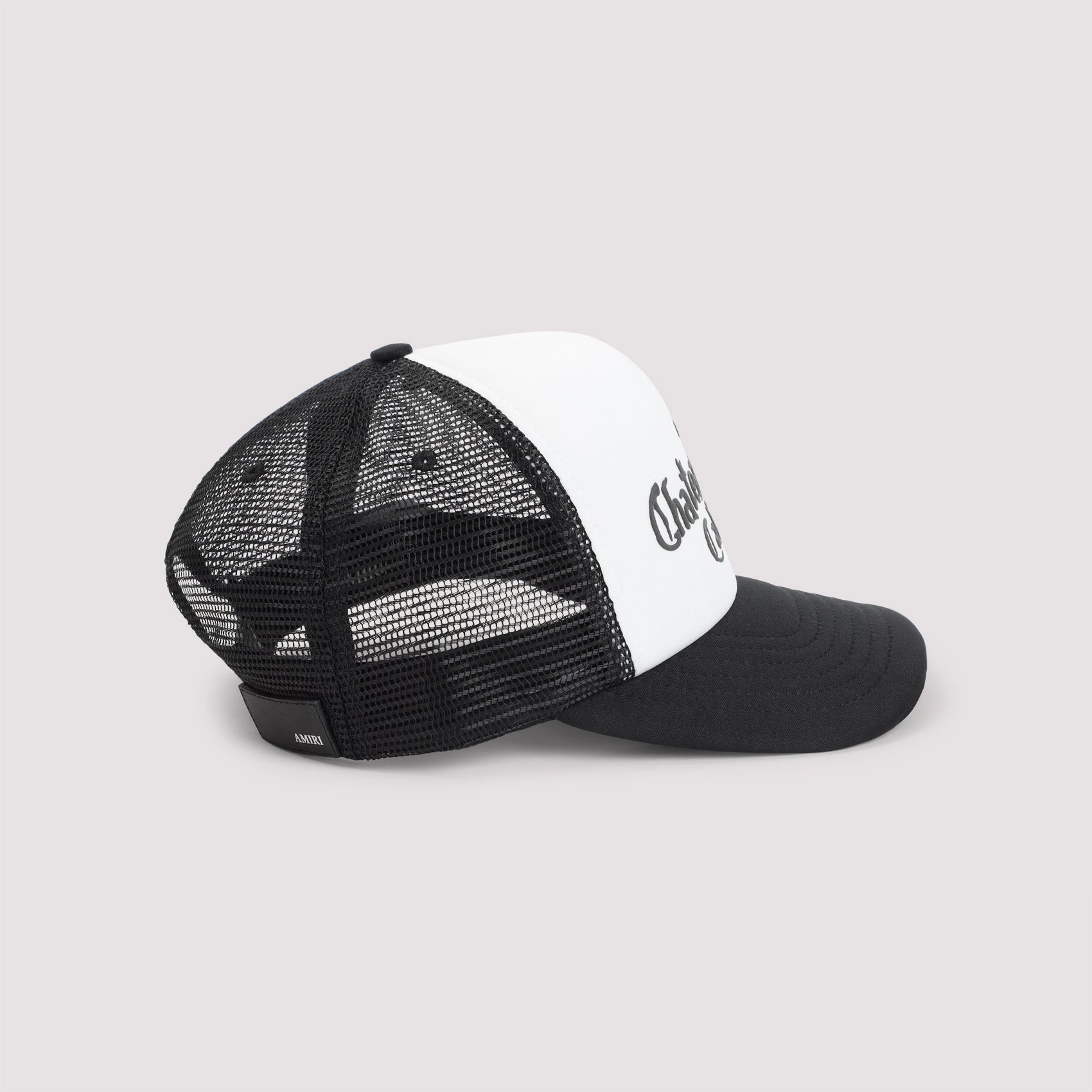 AMIRI CHATEAU BLACK POLYESTER HAT. BASEBALL HAT CRAFTED FROM WHITE TECH FABRIC AND BLACK MESH, FEATURING THE CHATEAU AMIRI LOGO ON THE FRONT, A BRANDED LABEL ON THE BACK, AND AN ADJUSTABLE RUBBER STRAP AT THE BACK.