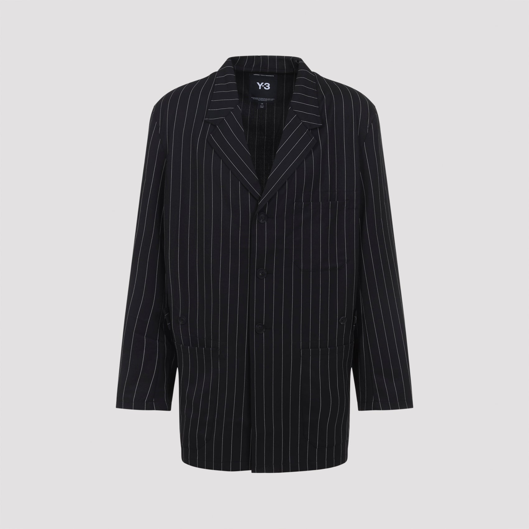 Crafted from premium black tech fabric with sophisticated pinstripes, this jacket features a classic notched collar, front button fastening, and functional pockets including a chest patch pocket and two front pockets. The belted back waist adds a refined touch, while the Y-3 logo stamped on the cuff showcases the brand's signature aesthetic.