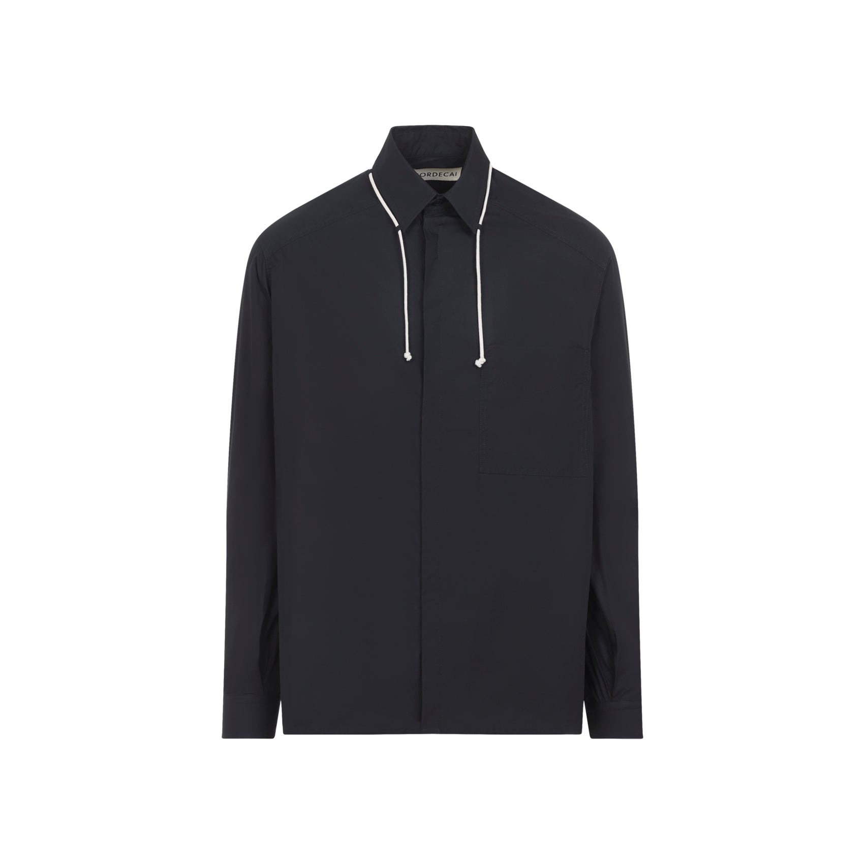 Crafted from pure black cotton, this classic shirt features a pointed collar accented with contrasting white nylon cord detail that adds a modern edge to the traditional silhouette. The front concealed button fastening creates a clean, streamlined look, while the patch pocket and long sleeves with buttoned cuffs offer both functionality and refined style.