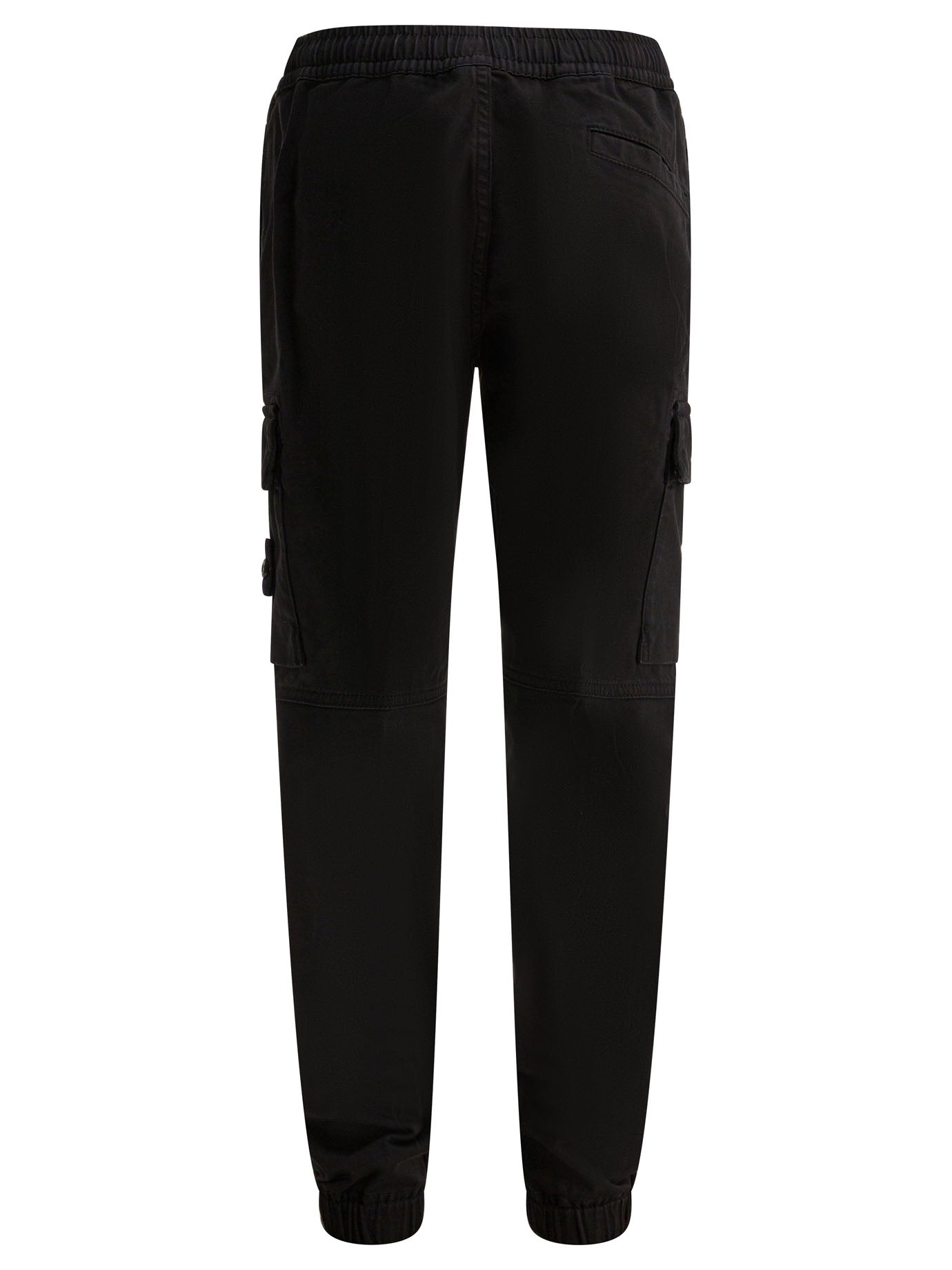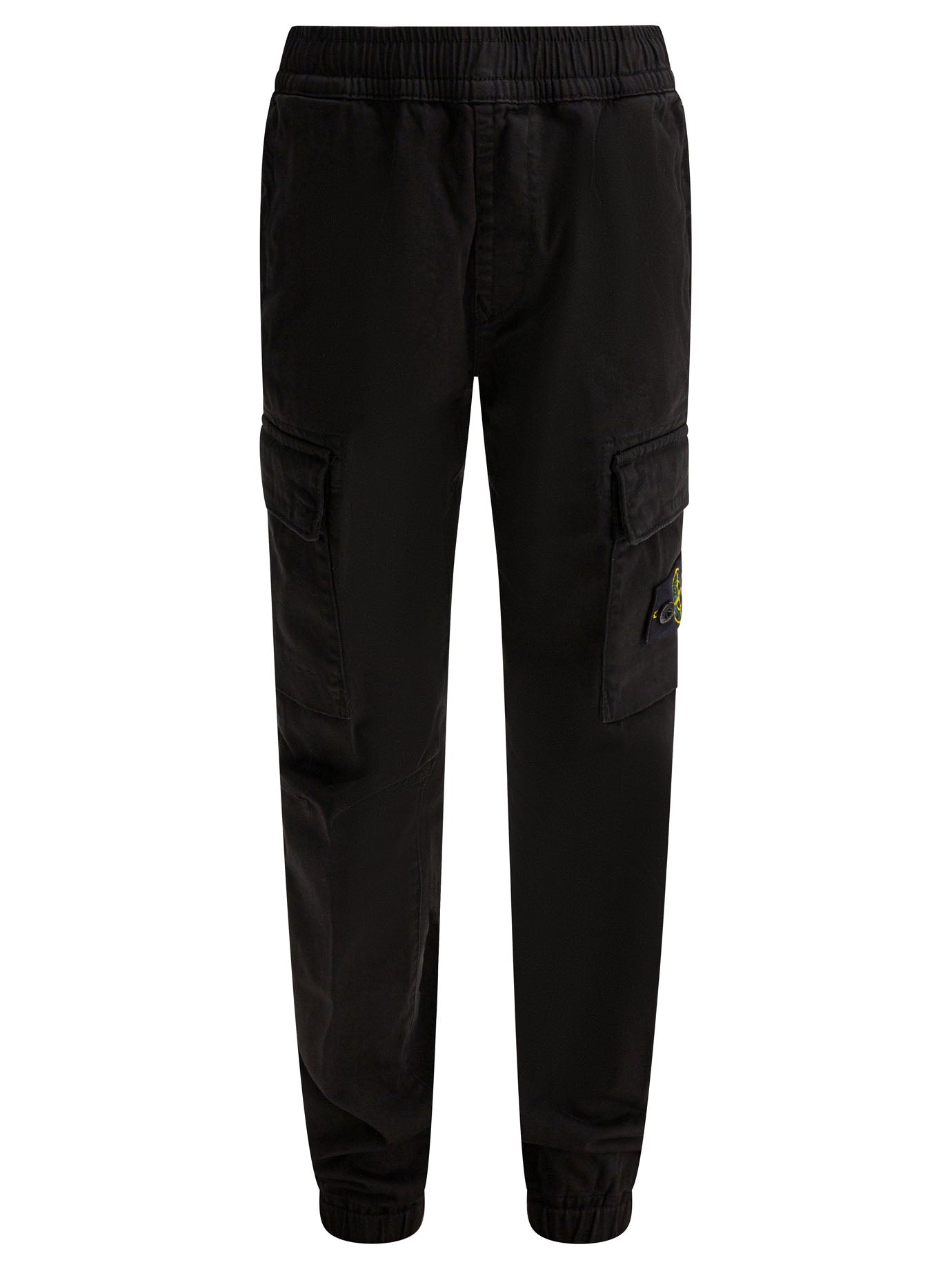 Elevate your casual wardrobe with these premium black cotton elastane trousers from STONE ISLAND KIDS. Featuring a comfortable elastic waistband and functional cargo pockets, these jogger-style pants combine utility with contemporary streetwear style.
