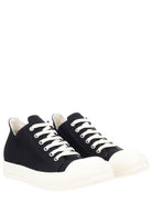Elevate your sneaker game with these striking black cotton sneakers from DRKSHDW, Rick Owens' coveted diffusion line. Crafted in Italy with meticulous attention to detail, these low-top sneakers feature a 100% cotton upper and a distinctive cream-colored platform sole that adds both height and edge to your look.