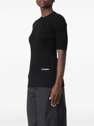 This elegant black cotton sweater from Jil Sander epitomizes minimalist sophistication and timeless style. Crafted from premium cotton, this fitted pullover features short sleeves and a classic crew neckline, making it a versatile wardrobe essential. The sleek silhouette offers a refined, body-conscious fit that pairs effortlessly with tailored trousers for the office or casual denim for weekend wear. Perfect for transitional seasons, this piece embodies Jil Sander's signature aesthetic of understated luxury and impeccable craftsmanship. Elevate your everyday wardrobe with this investment piece that seamlessly bridges comfort and contemporary elegance.