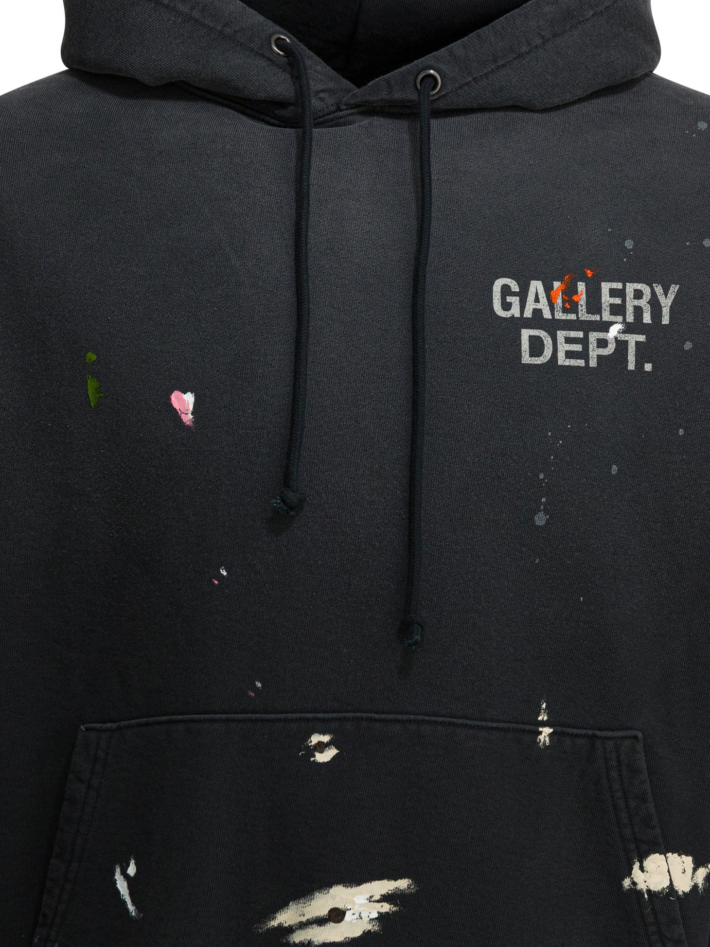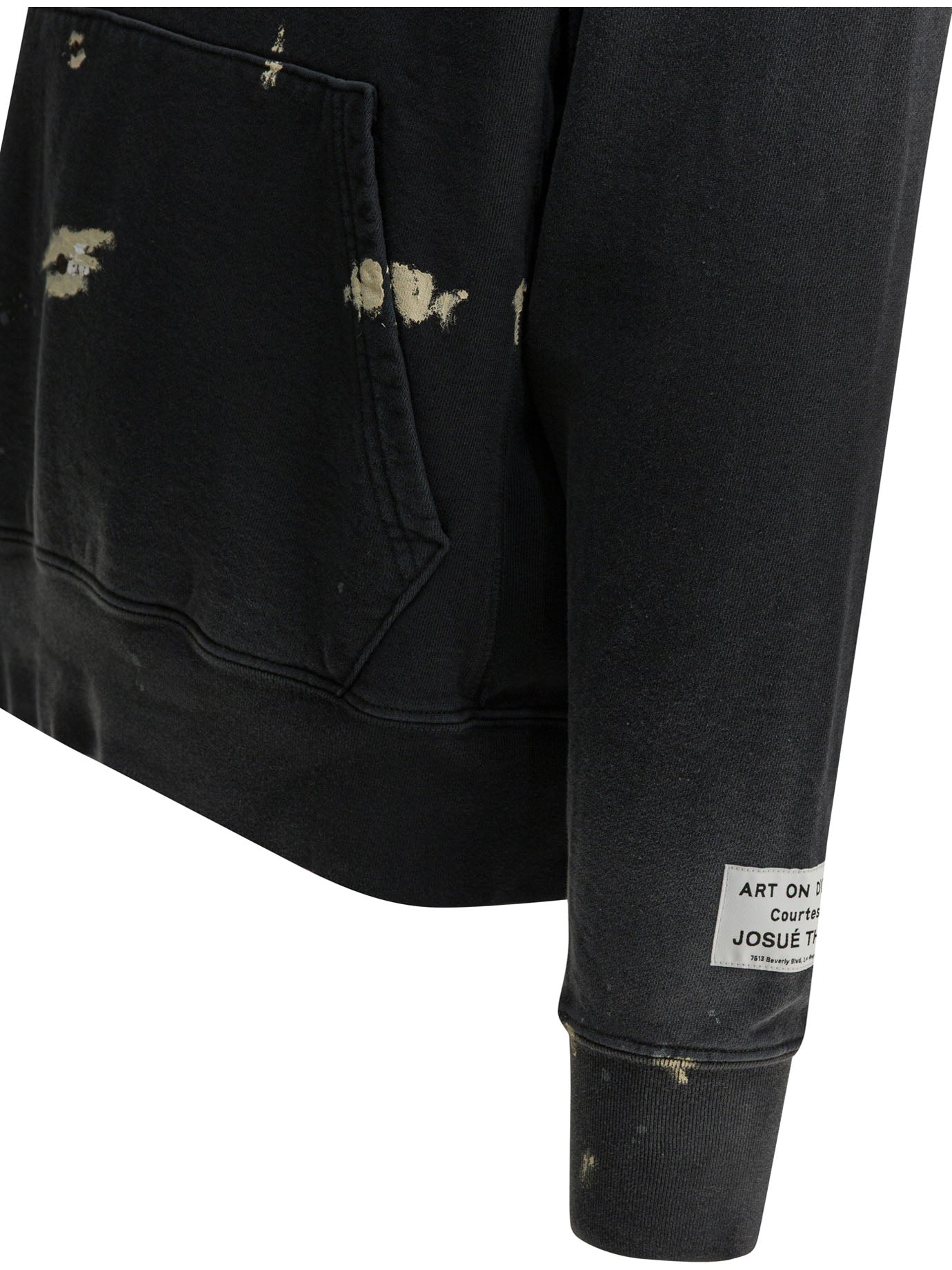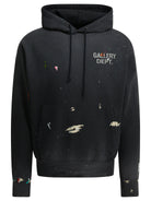 Elevate your off-duty wardrobe with this black cotton sweatshirt from GALLERY DEPT., a brand renowned for its artisanal approach to contemporary streetwear. This hooded sweatshirt features distinctive paint splatter detailing and distressed accents that give each piece a unique, one-of-a-kind character.