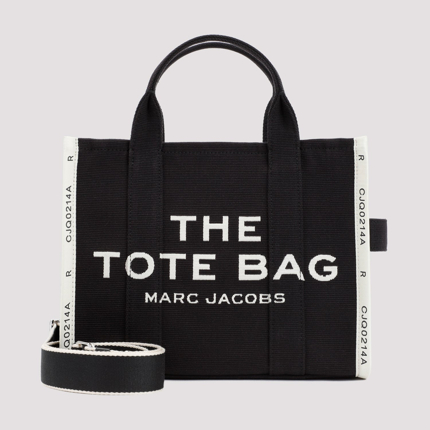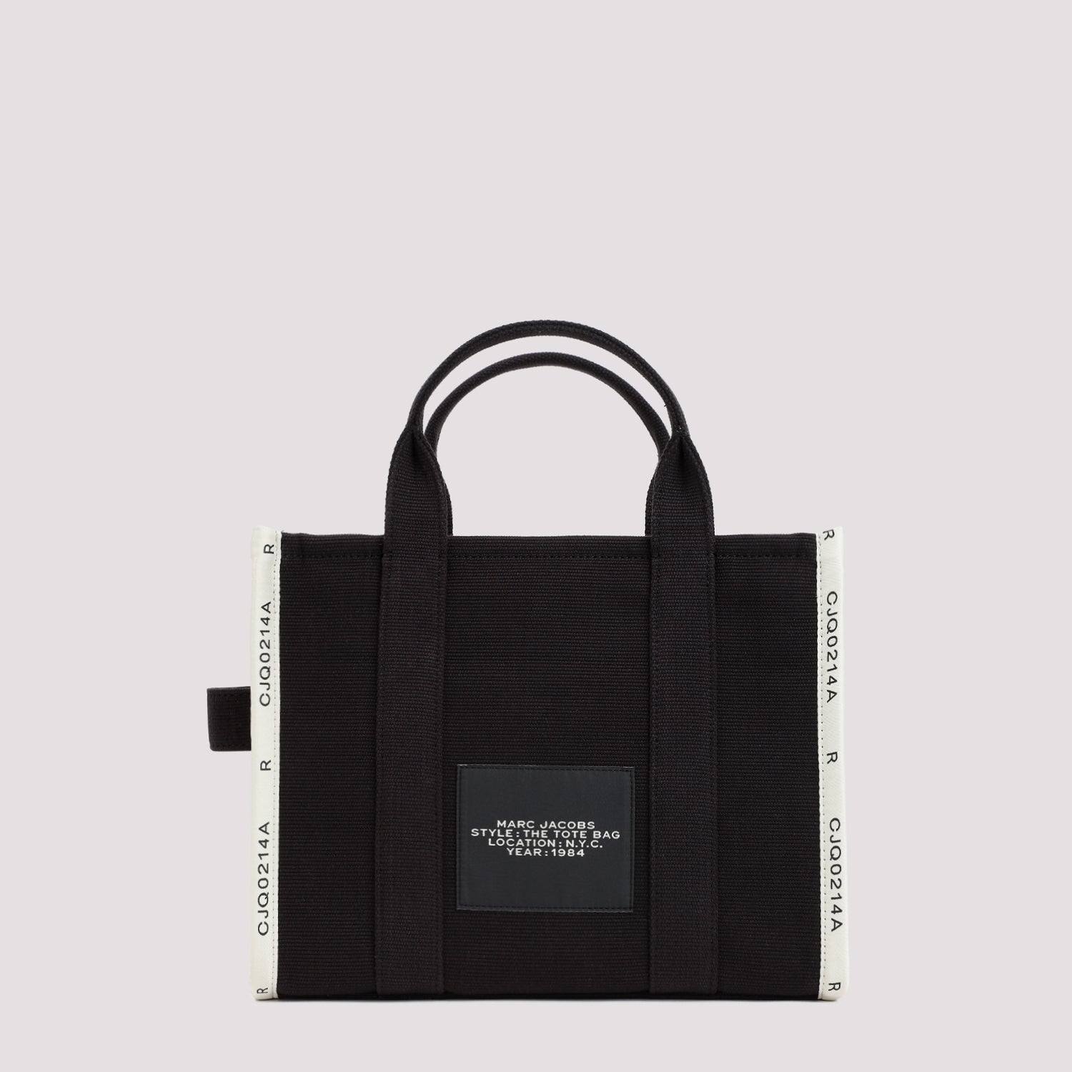 MARC JACOBS BLACK COTTON THE MEDIUM TOTE BAG. BLACK COTTON, SAND TRIM EMBELLISHMENT, TOP ZIP FASTENING, HANDLE ON TOP. ADJUSTABLE CROSSBODY BLACK WEBBING STRAP, 1 INTERIOR ZIP POCKET, 2 SLIP POCKETS, 1 CARD SLOT. FULLY LINED, THE TOTE BAG PRINTED ON FRONT IN SAND.