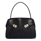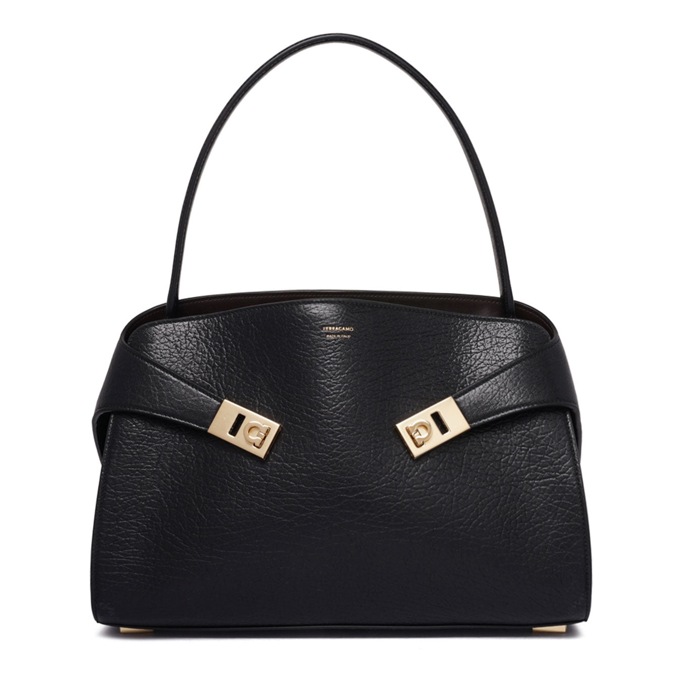 Elevate your everyday elegance with this stunning structured satchel from Ferragamo. Crafted in luxurious black leather with a sophisticated pebbled texture, this timeless handbag features distinctive gold-tone hardware accents that add a touch of refined glamour.