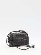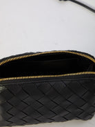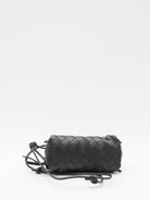 Intrecciato Concert bag in black leather with Intrecciato motif. It features shoulder strap with knotted details, two-way zip closure, one main interior compartment and one interior card slot. Dust bag included. Any leather imperfections are not to be considered manufacturing defects, but a peculiarity of the material.