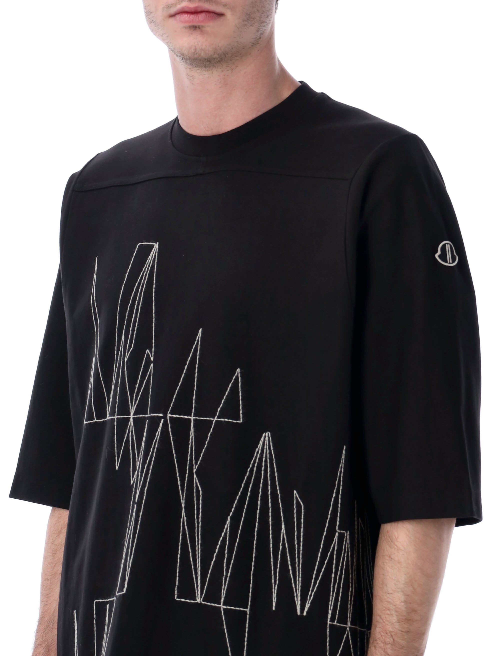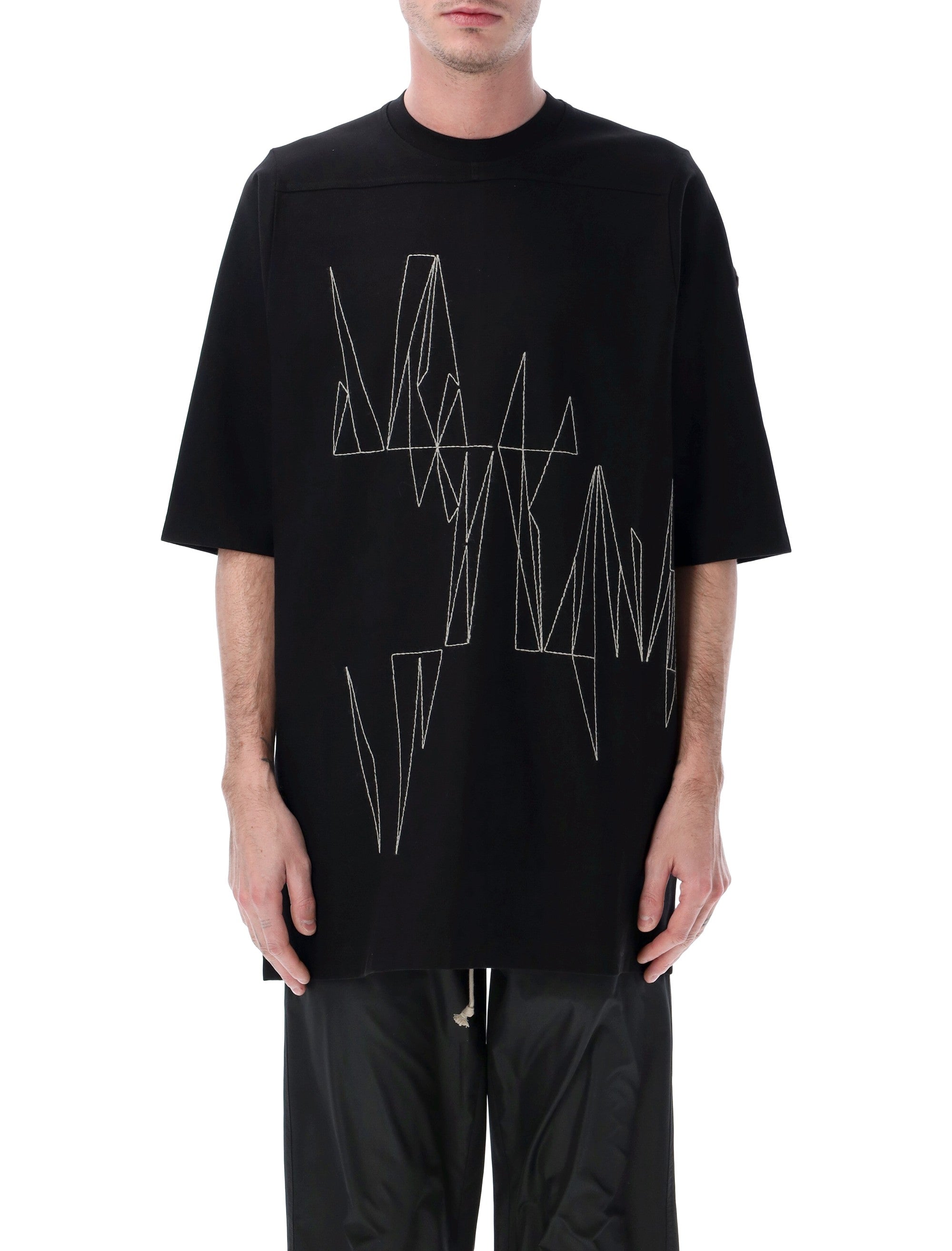 The standout design showcases bold contrasting white topstitch embroidery in a geometric pattern across the front, creating a dramatic visual statement that embodies Rick Owens' avant-garde aesthetic. A subtle logo patch adorns one sleeve, adding an authentic designer touch.