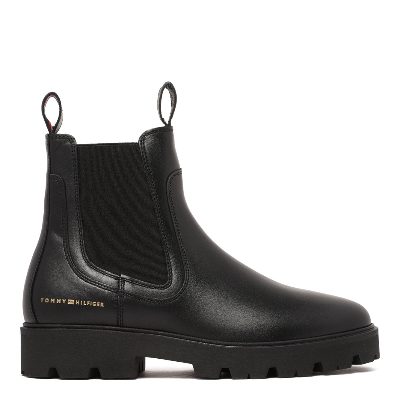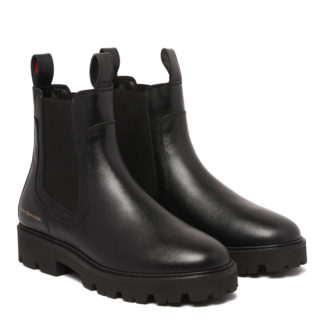 Elevate your everyday style with these sleek black leather boots from Tommy Hilfiger. Featuring classic Chelsea boot styling with elastic side panels and convenient pull tabs, these boots offer effortless on-and-off wear while maintaining a polished, sophisticated look.