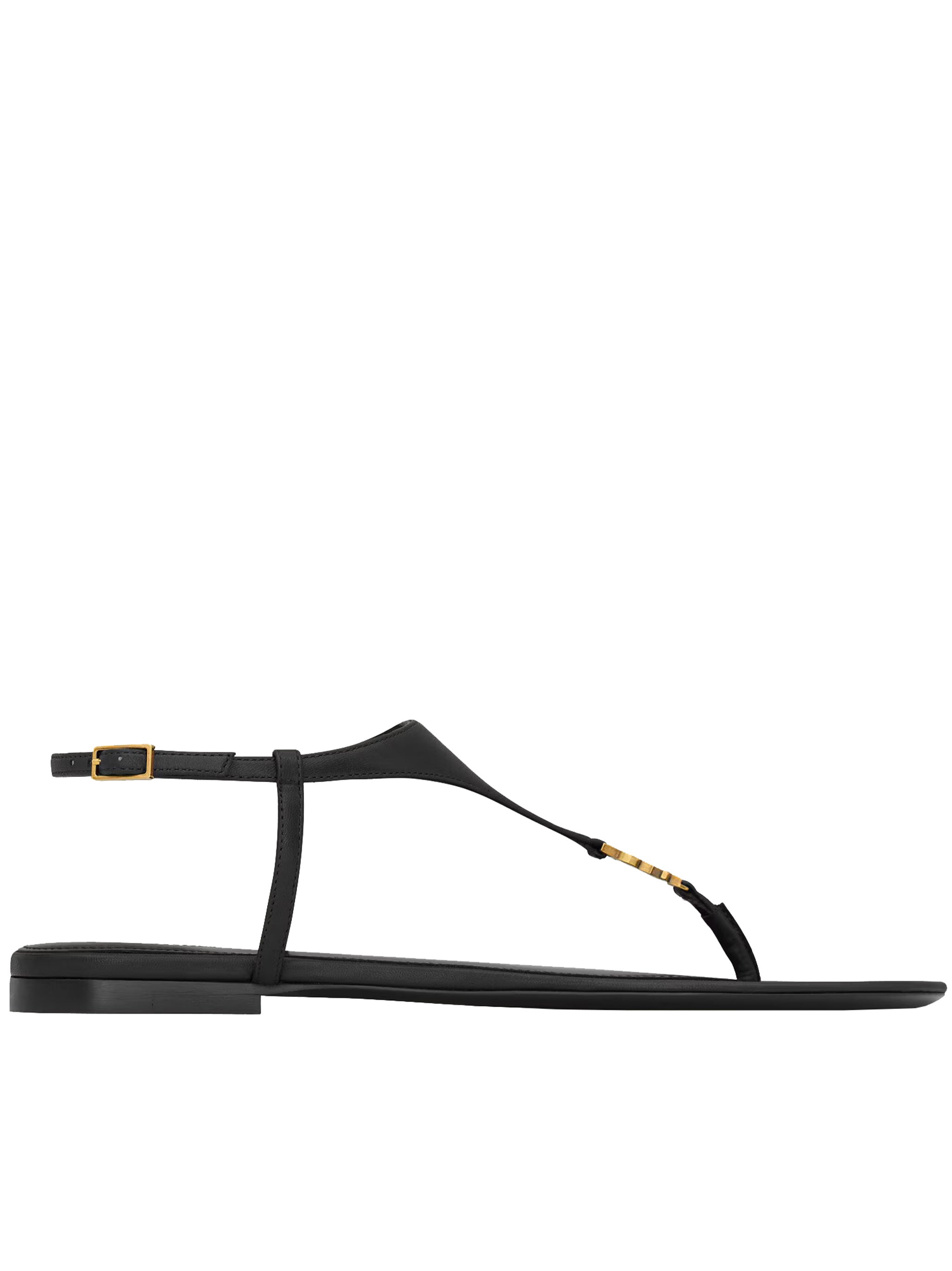 Elevate your warm-weather wardrobe with the Saint Laurent Cassandra 05 sandal in luxurious black leather. This elegant flat sandal features a sleek T-strap design with gold-tone hardware accents and an adjustable ankle strap for a perfect fit.