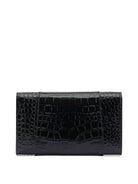 Elevate your evening ensemble with this stunning Black Leather Clutch from Balenciaga. Crafted from luxurious crocodile-embossed leather, this sophisticated accessory features the iconic gold-tone "B" logo clasp that adds a touch of signature elegance.