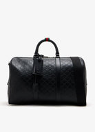 Elevate your travel experience with this sophisticated Black Leather Emblem Travel Bag by Gucci. This luxurious duffle features the iconic embossed GG monogram pattern across premium black leather, creating a timeless and elegant aesthetic. Designed for the discerning traveler, this spacious bag includes a comfortable shoulder strap for easy carrying, along with practical address and key tags for added convenience and security. The padlock closure ensures your belongings stay safe while you're on the move. Perfect for weekend getaways, business trips, or any travel adventure, this Gucci travel bag seamlessly combines Italian craftsmanship with functional design. The structured silhouette and refined details make it an investment piece that will serve you well for years to come.