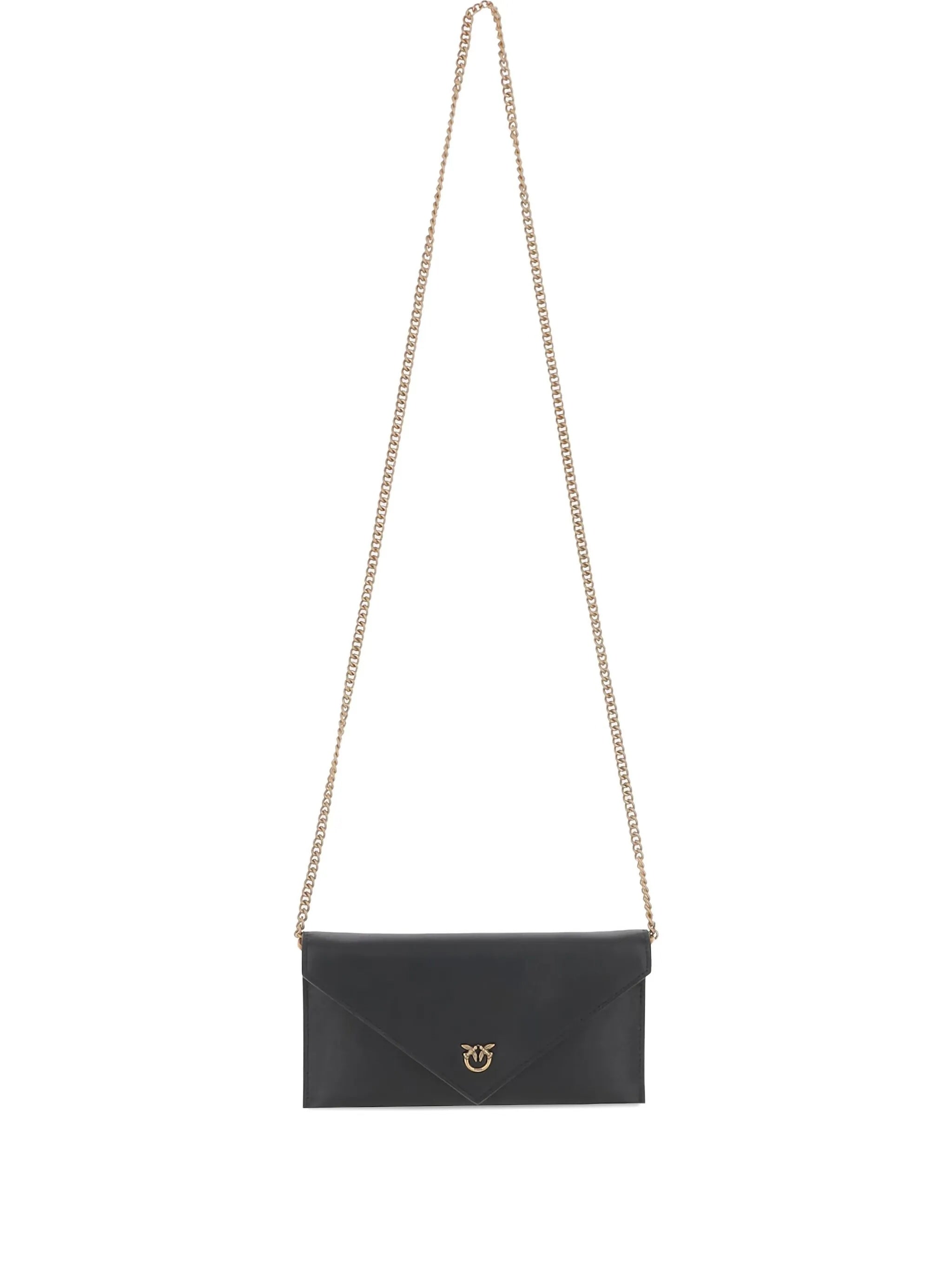 Elevate your evening ensemble with this sleek Black Leather Flat Purse Mini from Pinko. Crafted from premium leather, this sophisticated envelope-style bag features an elegant chain strap that allows for versatile wear as a crossbody or shoulder bag.